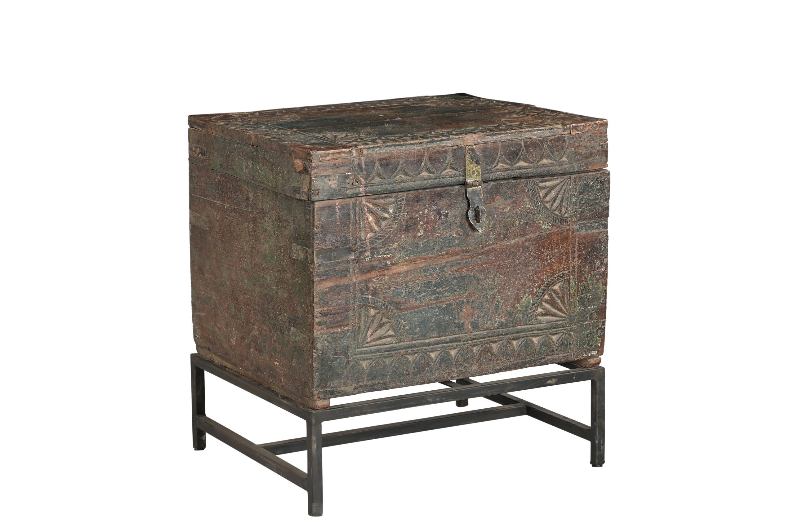 Antique Indian Carved and Painted Chest on Iron Legs, 24Hx23x19