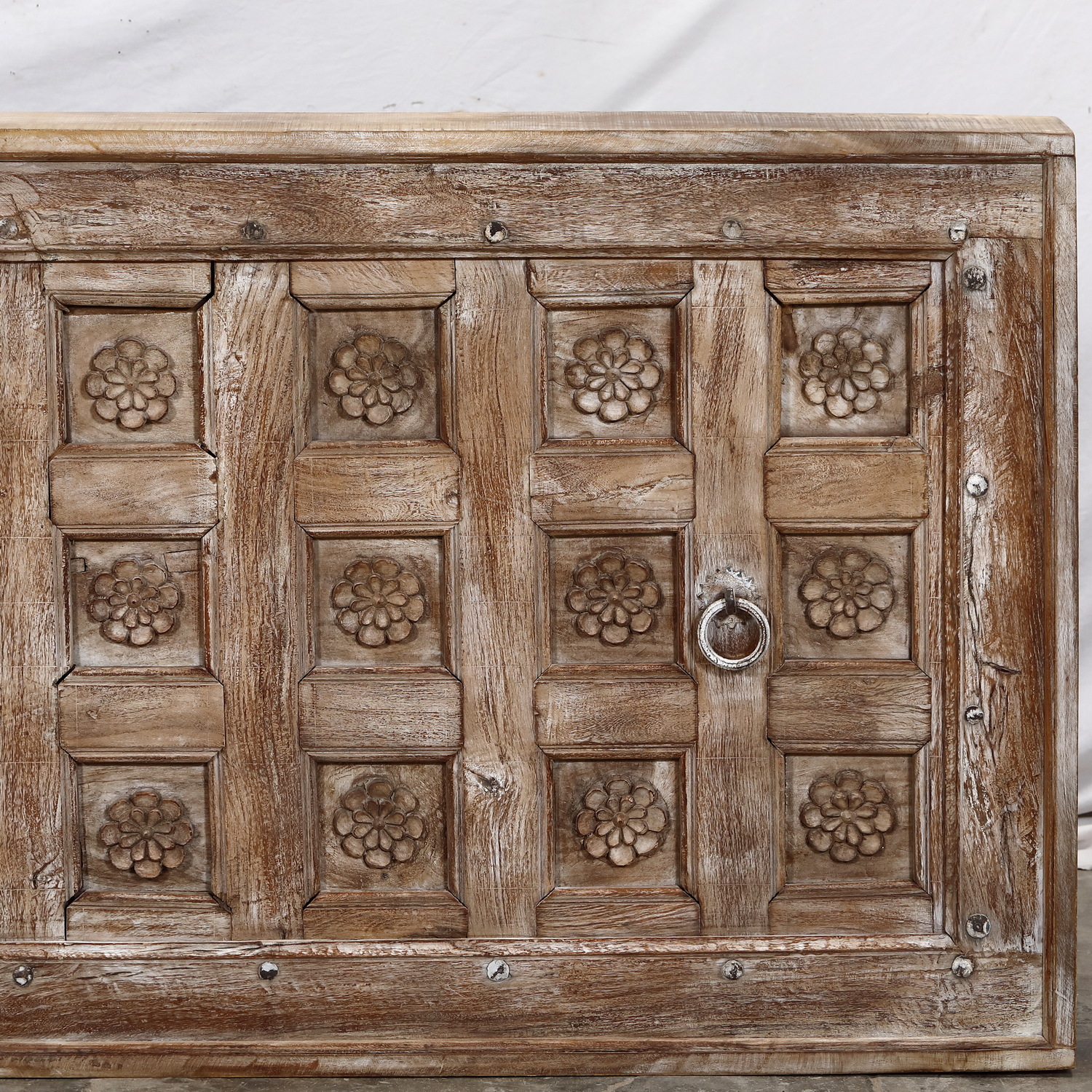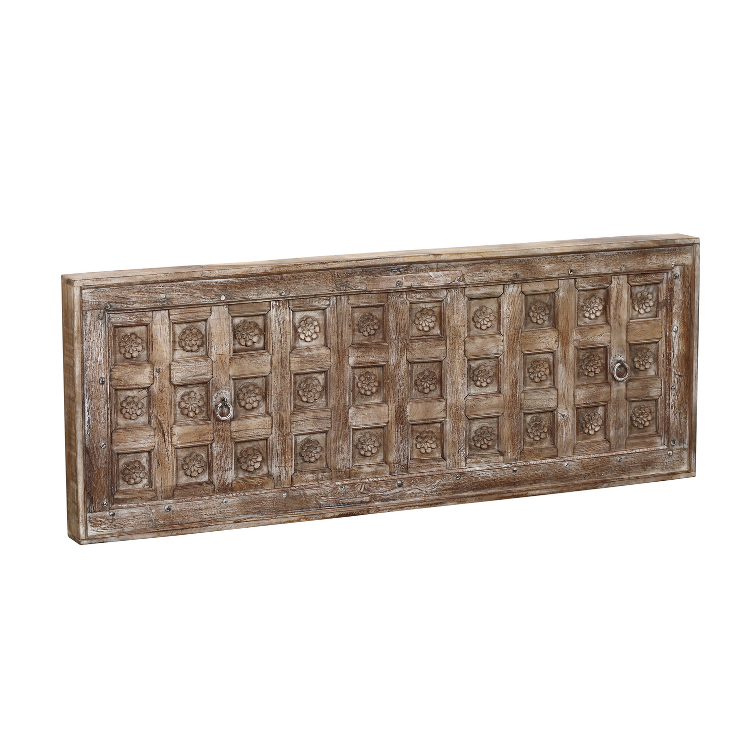 We search India and other Asian countries for our excellent selection of antique and vintage doors. All of these doors, unless noted as a single panel, are 2 panels that open in the middle and are braced together in the back for transportation and display. The braces are easily removed. Most of these pieces are functional as door units but may also be converted into other furniture pieces such as headboards or table tops.