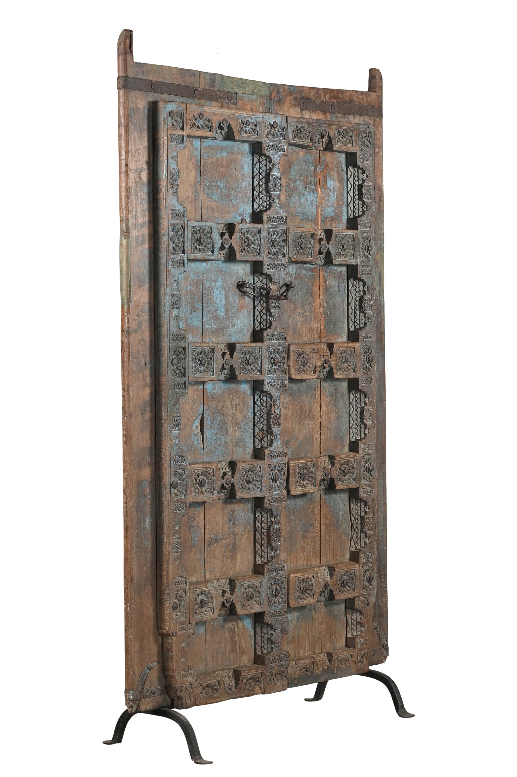We search India and other Asian countries for our excellent selection of antique and vintage doors. All of these doors, unless noted as a single panel, are 2 panels that open in the middle and are braced together in the back for transportation and display. The braces are easily removed. Most of these pieces are functional as door units but may also be converted into other furniture pieces such as headboards or table tops.
