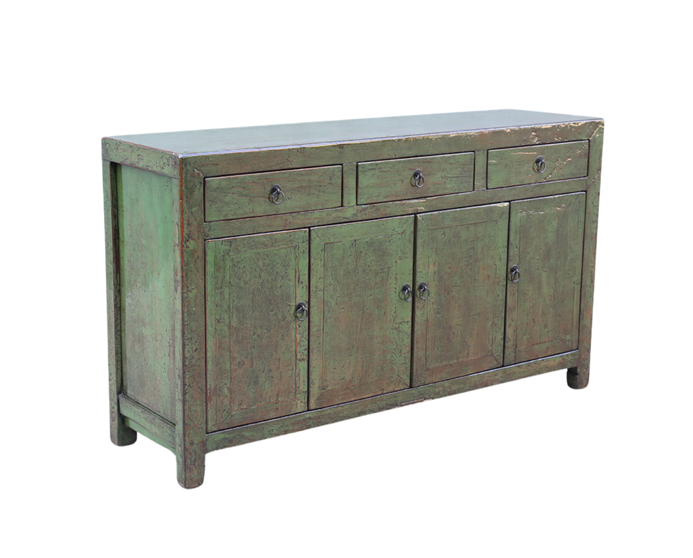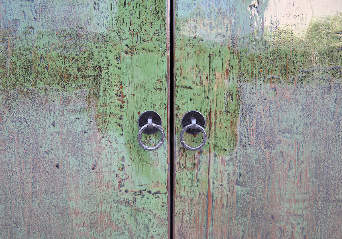 Antique Chinese furniture was almost always originally lacquered. The late 19th/early 20th century furniture we mostly sell, came near the end of the last Chinese imperial dynasty, the Qing Dynasty. Most of the furniture was decorated in the imperial colors, red, black, and gold. We find some old cabinets that just need restoration to the case and the paint retouched. And we find some that the finish is not good, so we have them restored and repainted, in colors that were not used during this period, such as blues, greens, and orange/golds. After finding the pieces we send them to a workshop in Shandong and after restoration and repainting where necessary, we have the pieces lacquered several times. These lacquer pieces are often our most popular furniture we stock.