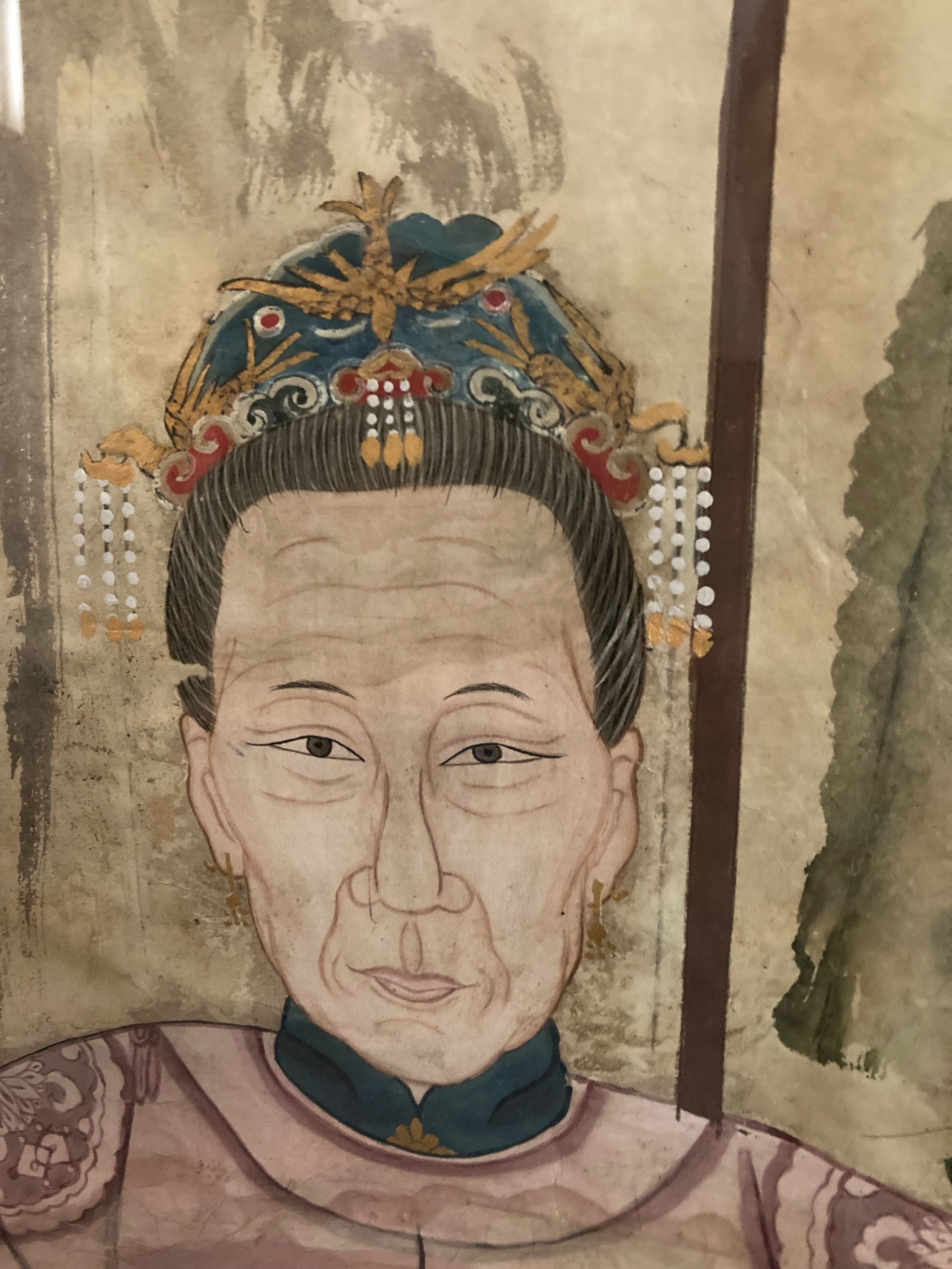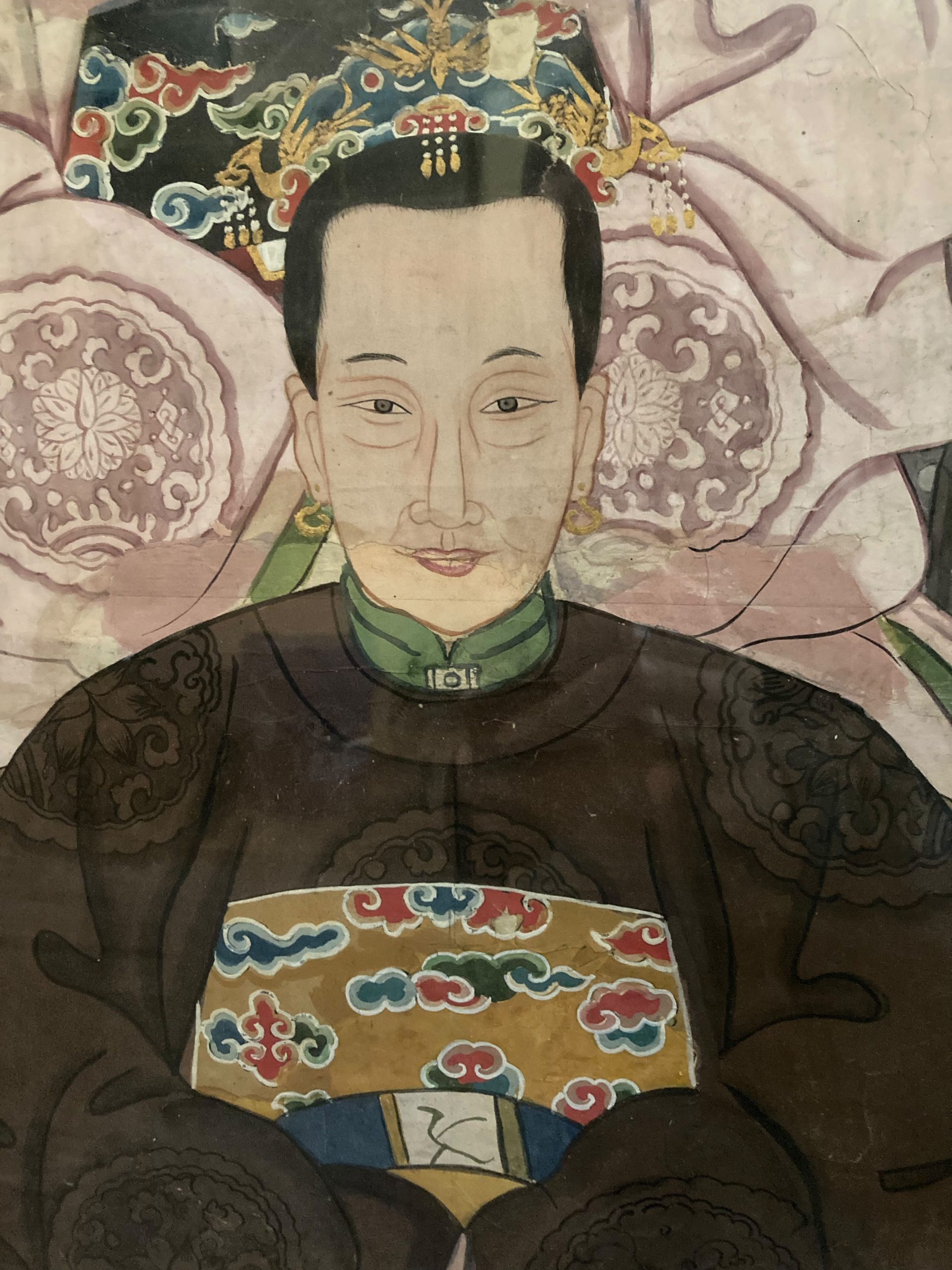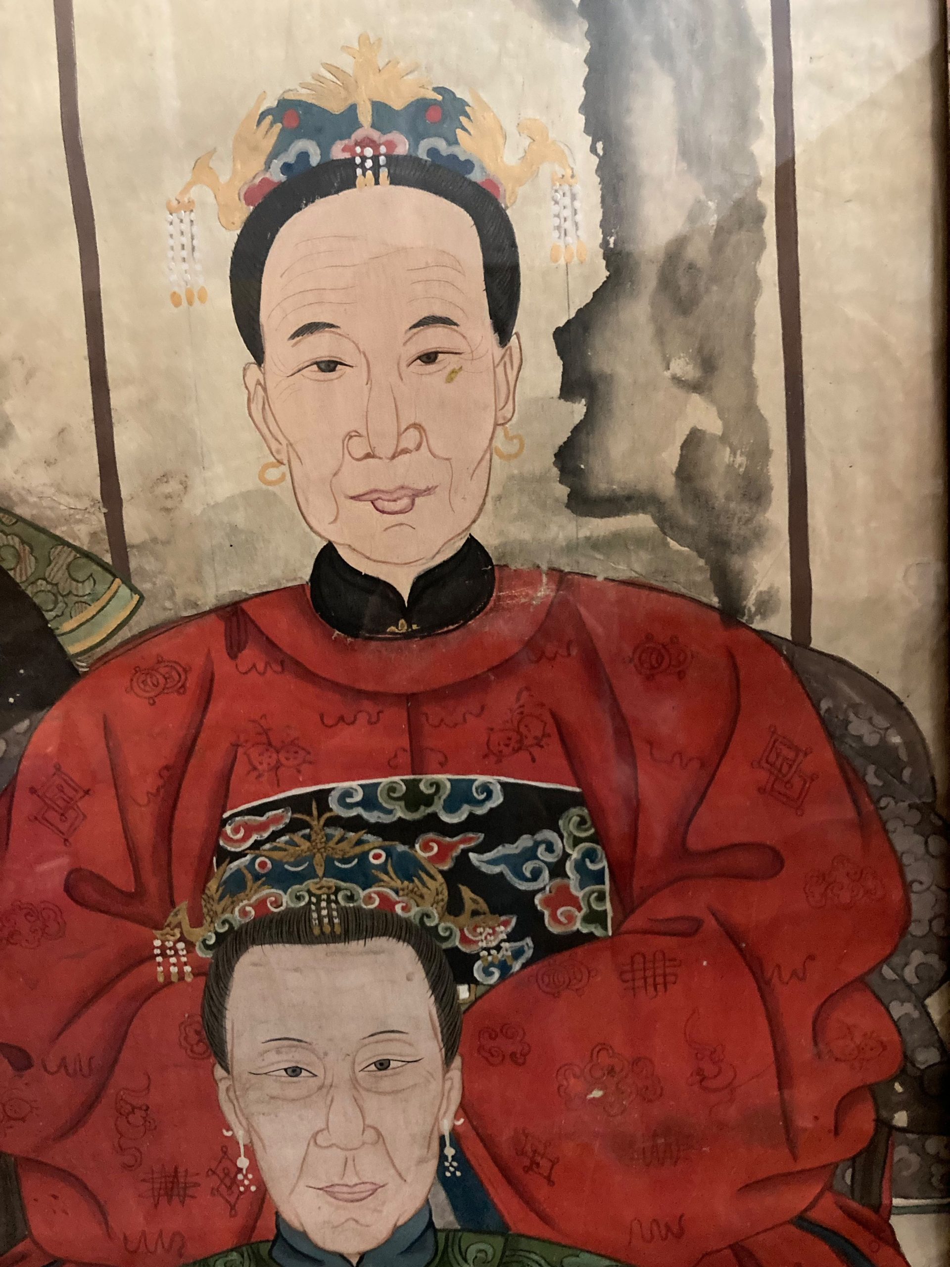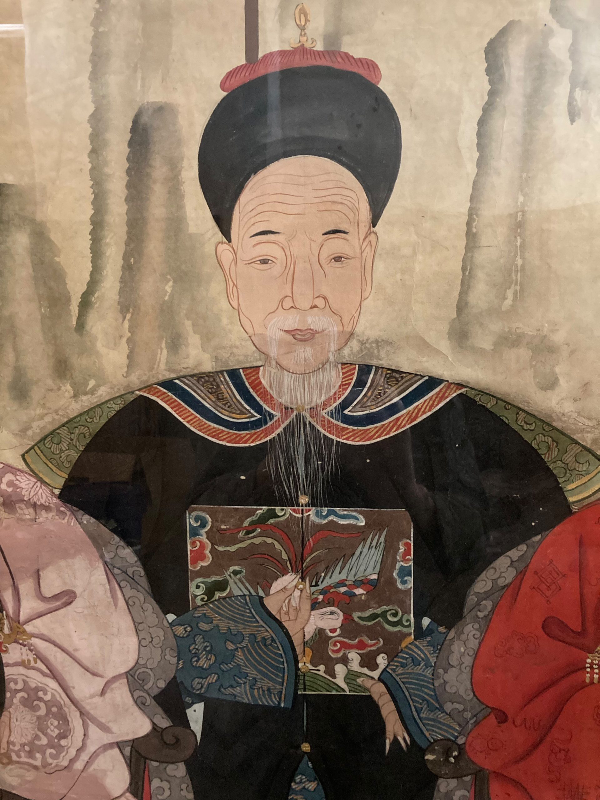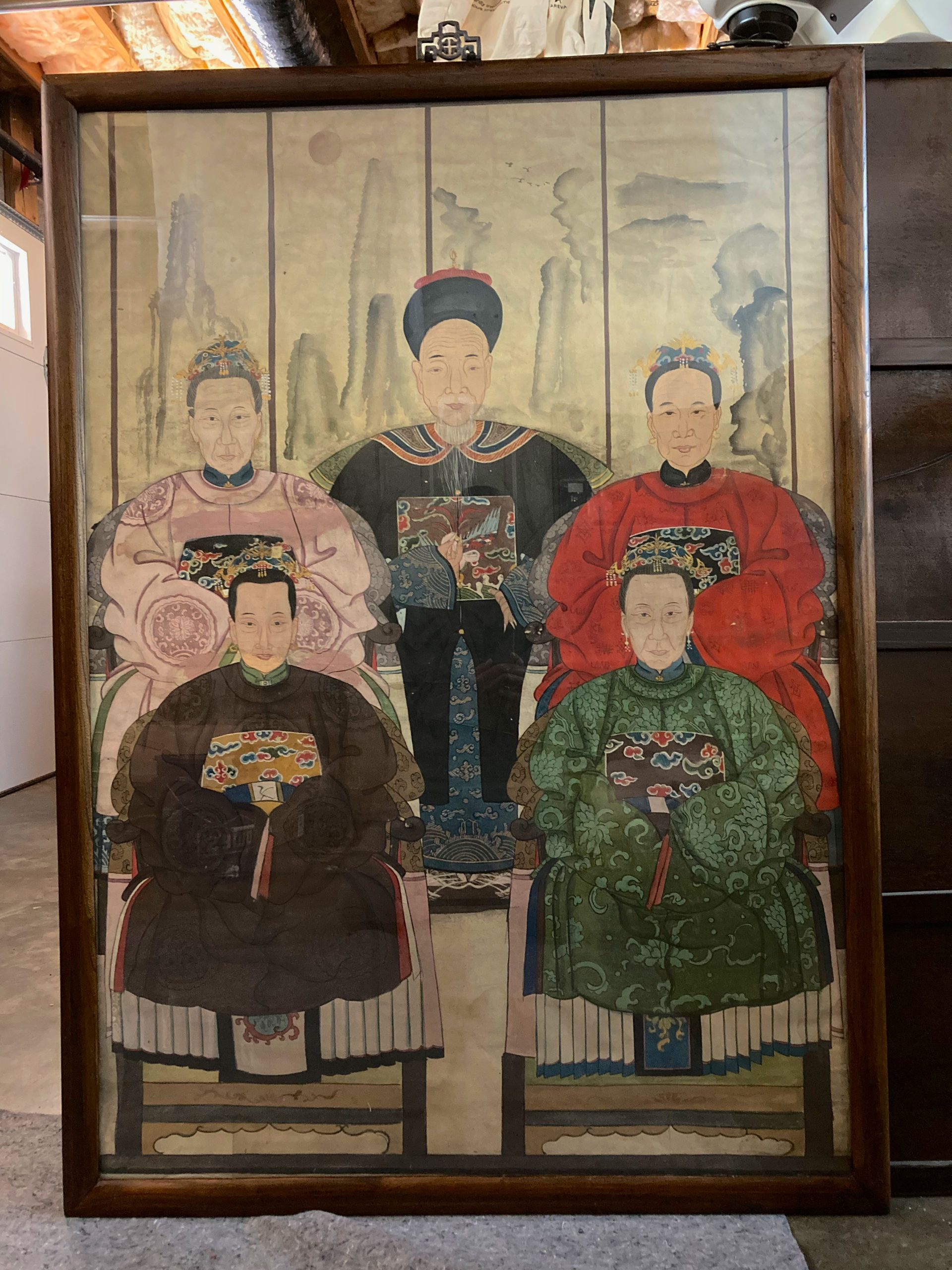 Antique Chinese Ancestral Portrait, gouache on paper, late Qing Dynasty, c. 1900, and were painted to honor deceased family members. This portrait of a noble family shows a distinguished gentleman and 4 women seated in horsheback chairs. All are wearing silk robes with embroidered chest plates, and the woman have jeweled headdresses or crowns and the matriarch on the lower right has pearl earrings. Signs of age, and in a vintage frame with a classic brass hanging handle.
