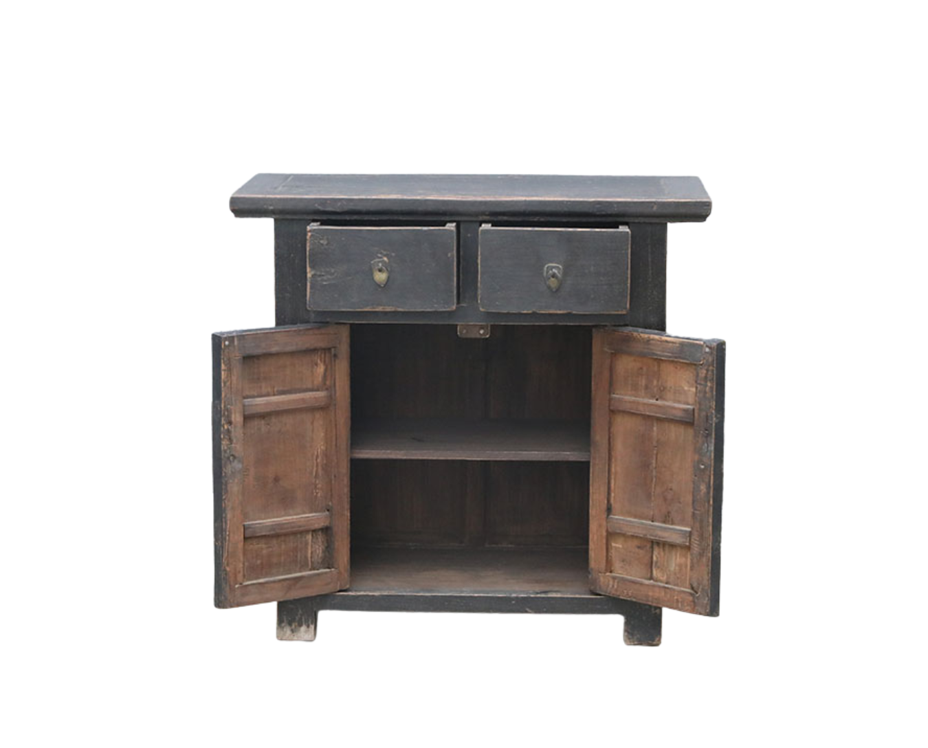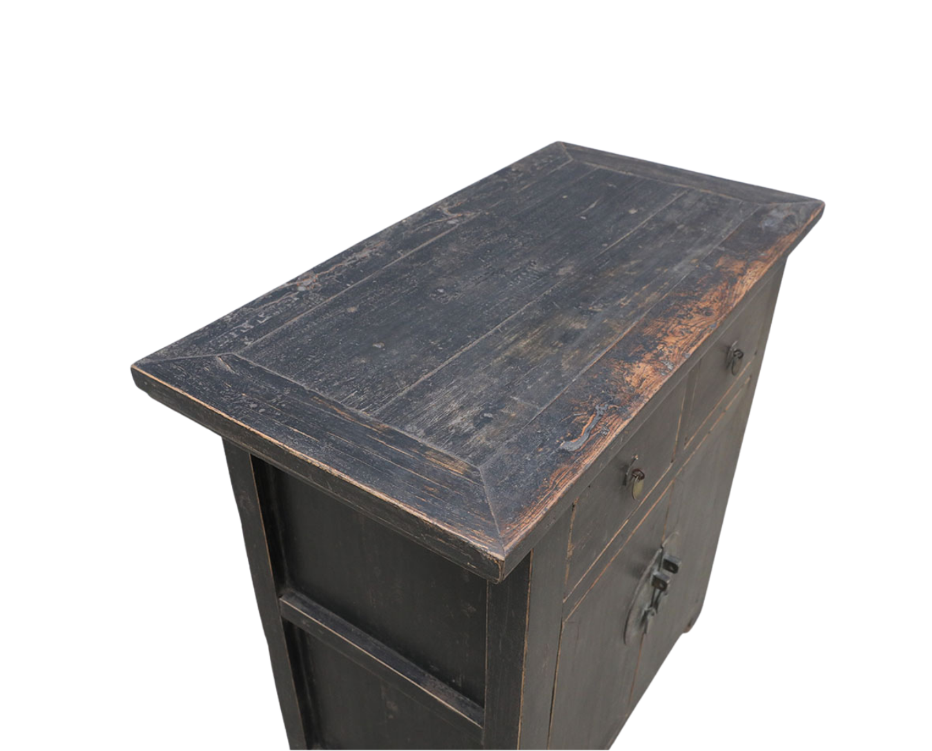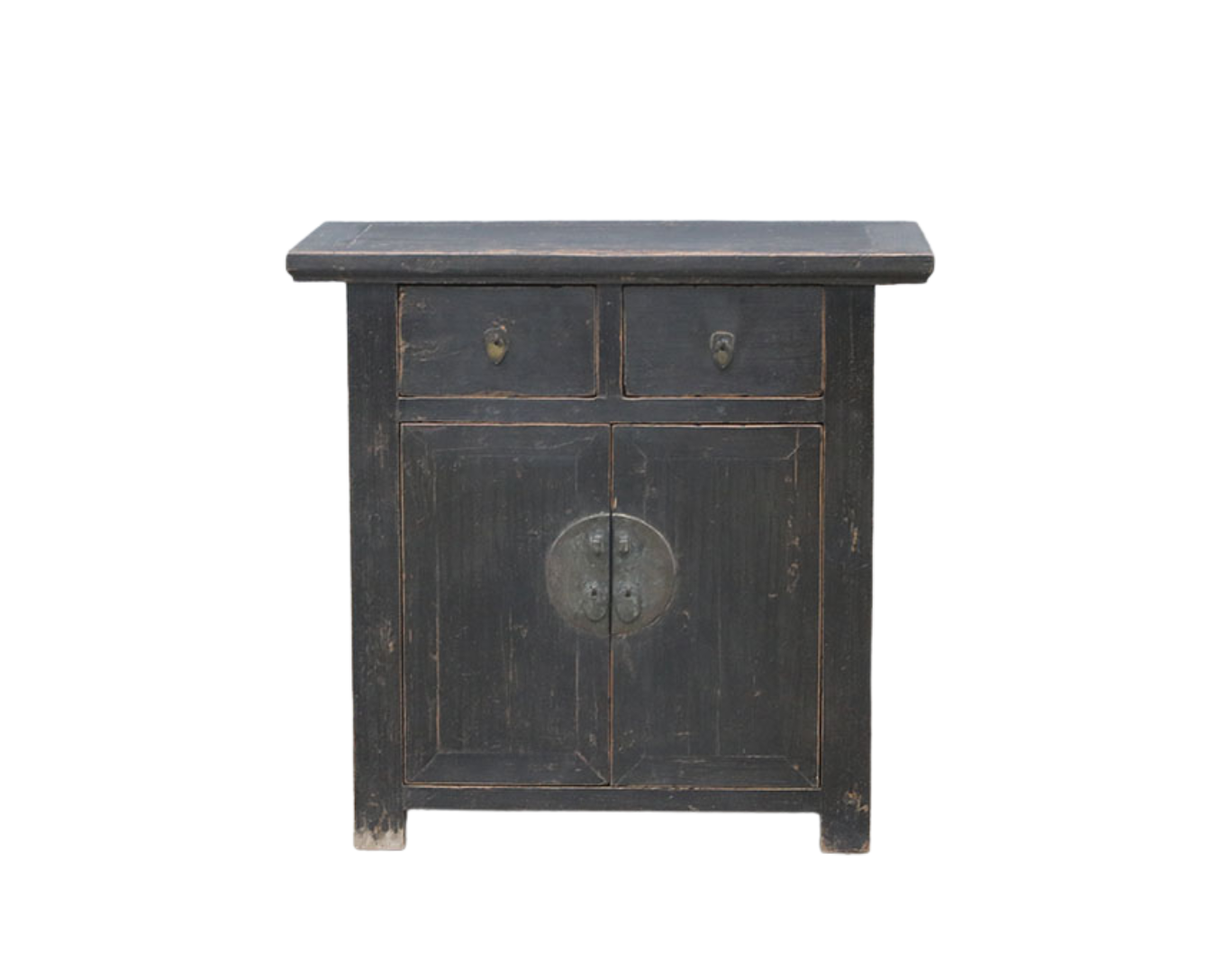 Antique Chinese Painted Elm Hall Cabinet, in its original faded black lacquer finish, 2 drawers over 2 doors with round brass moon door hardware. Late Qing Dynasty, c. 1900