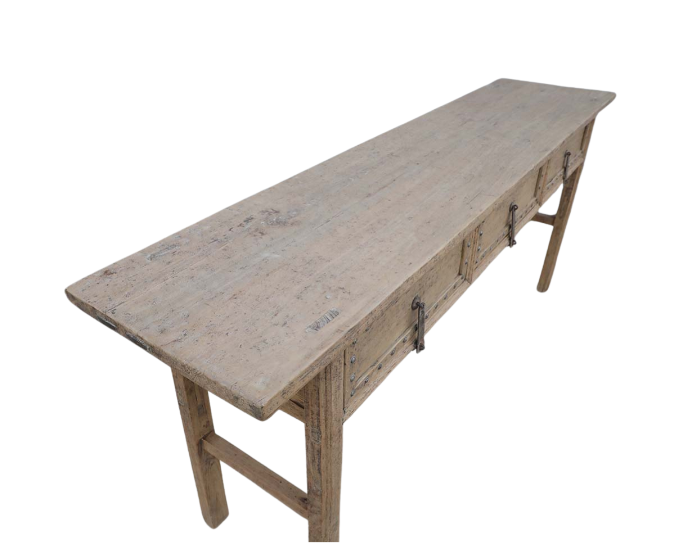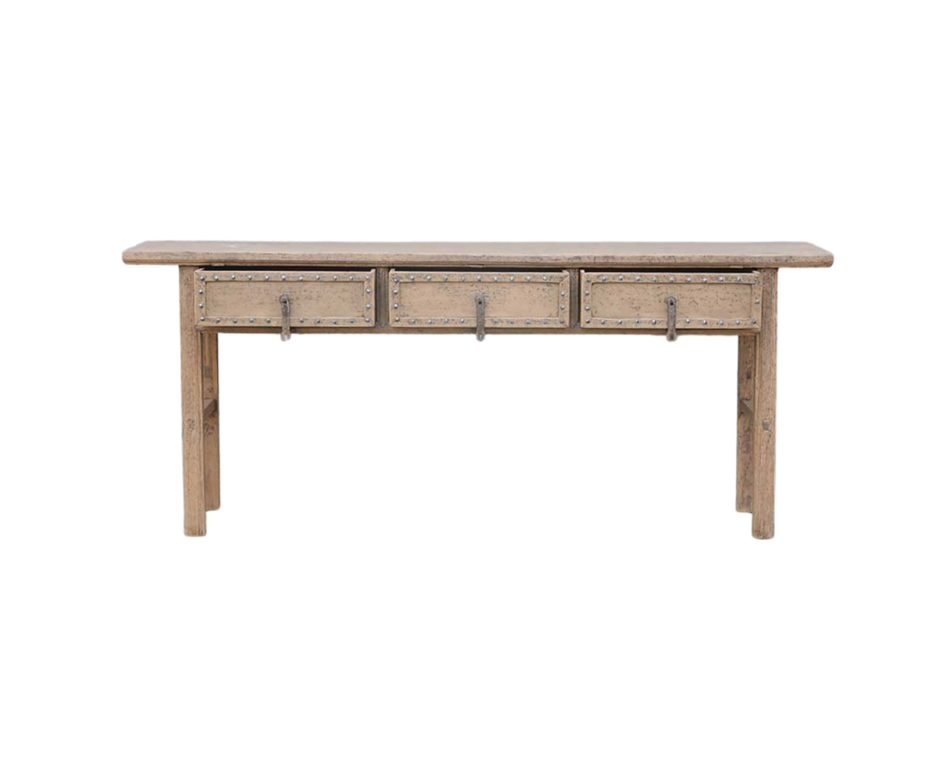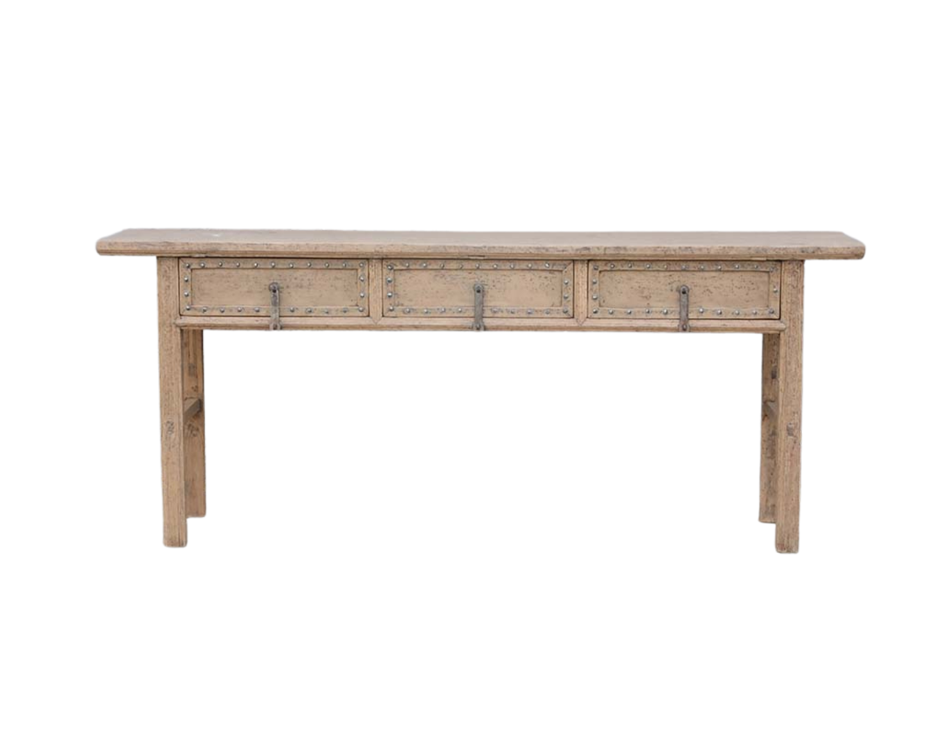 Antique Chinese Bleached Elm Console Table, with 3 drawers having the molded edges decorated with pewter or iron nailheads. Originally brown or black lacquered, the bleached elm has become a magical color. Completely original with its iron lock clasps. Late 19th century, late Qing Dynasty from Shanxi province. 33.5Hx81x18