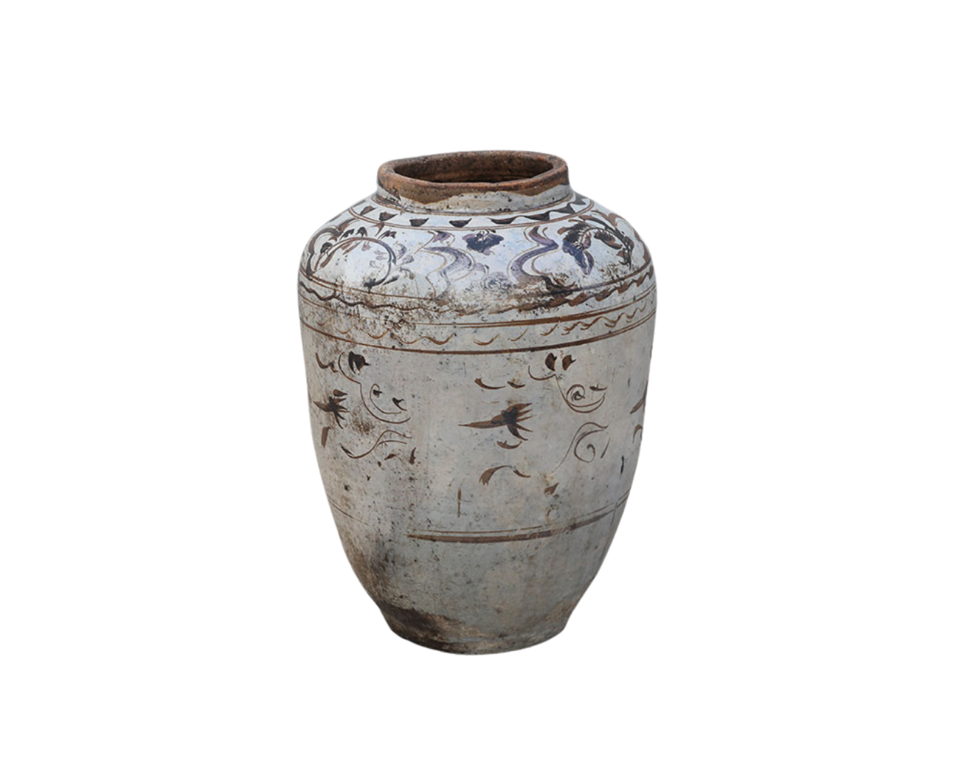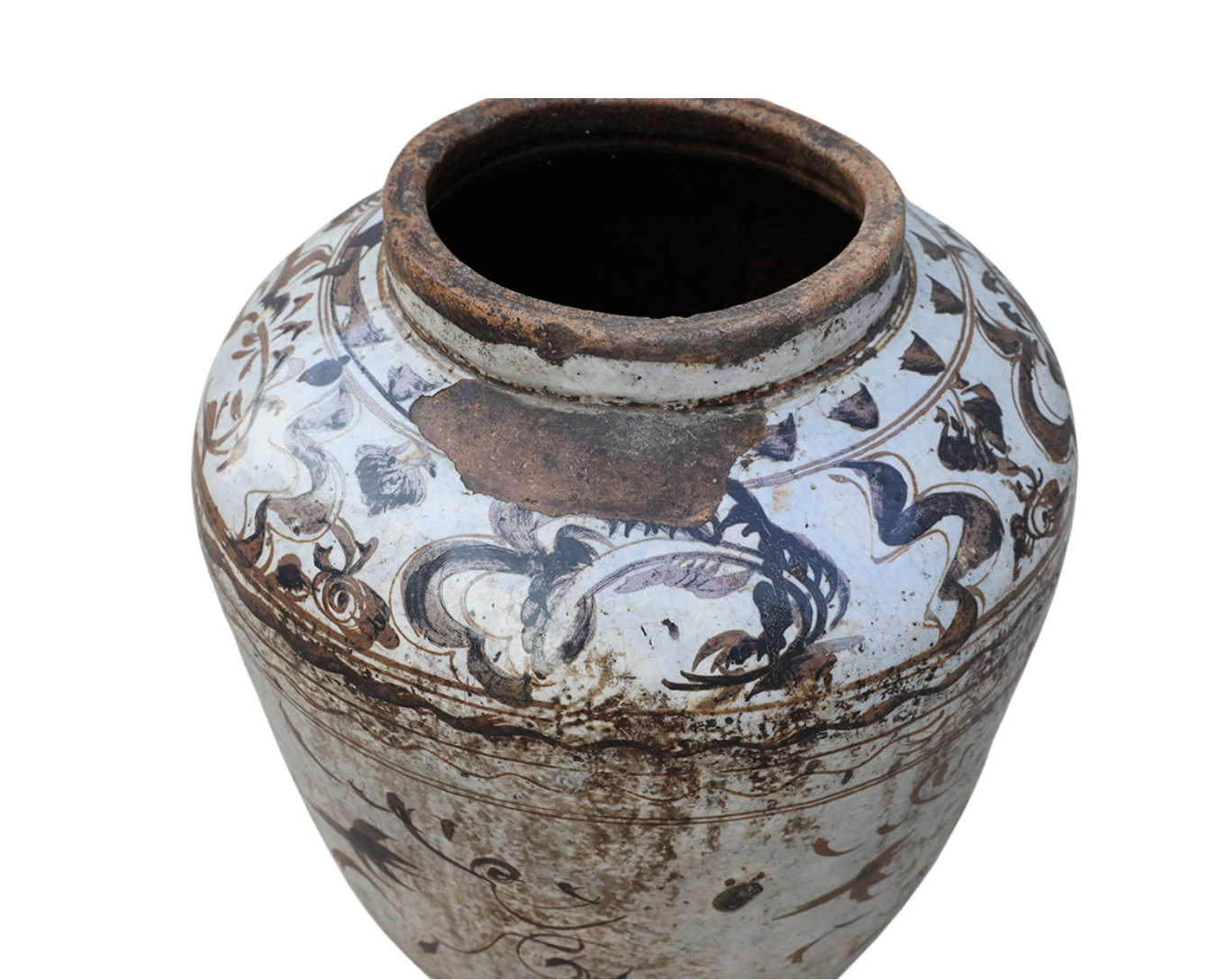 Antique Chinese Wine Jar, a classical form in a white glaze background with brown and black calligraphy designs. Late Qing Dynasty, c. 1900 24Hx17.5x17.5