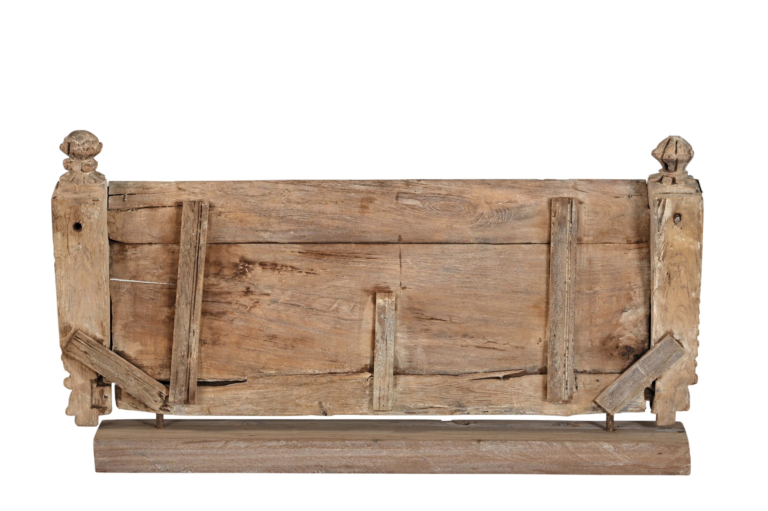 Antique Indian Carved Teakwood Balcony Front on a Stand, profusely carved with lotus flowers at the top, with finials and carved figures in the corners. From a high quality haveli from southern India, c. 1880. It would make a fantastic fireplace screen!