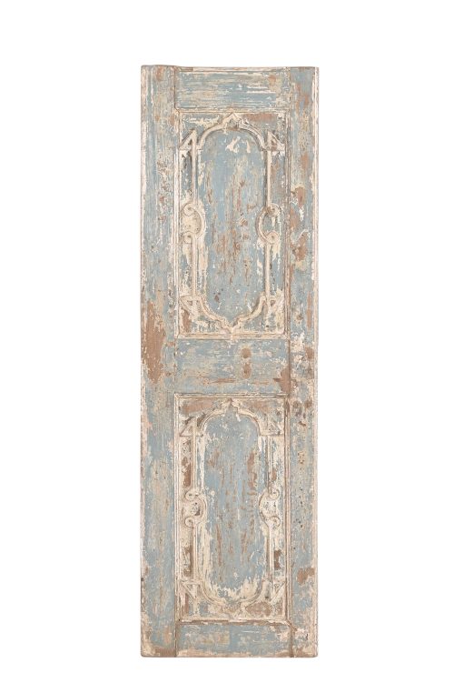 Antique Euro-Indian Painted and Carved Teakwood Panel, in the Italian rococo style, with much of its old blue/gray and white paint finish. C. 1900-30. This panel can be hung as wall art in either direction or used as a wall-mounted headboard. 53Hx16x1