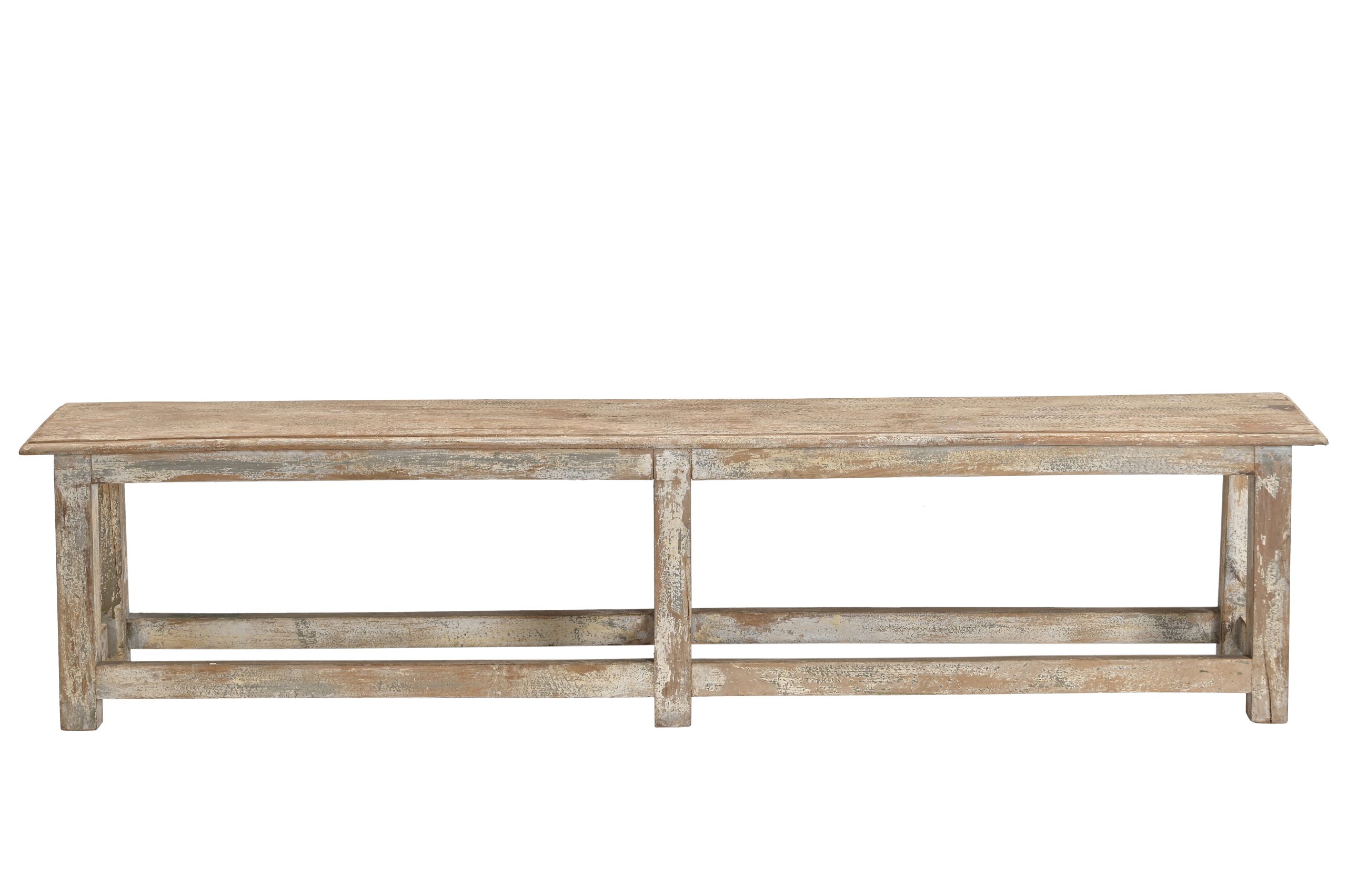Vintage Indian Painted Teakwood Bench, a sturdy country style with stretchers all around, with several different coats of old paint still visible. This piece will arrive in Santa Fe in mid-November '25. 17Hx72x12