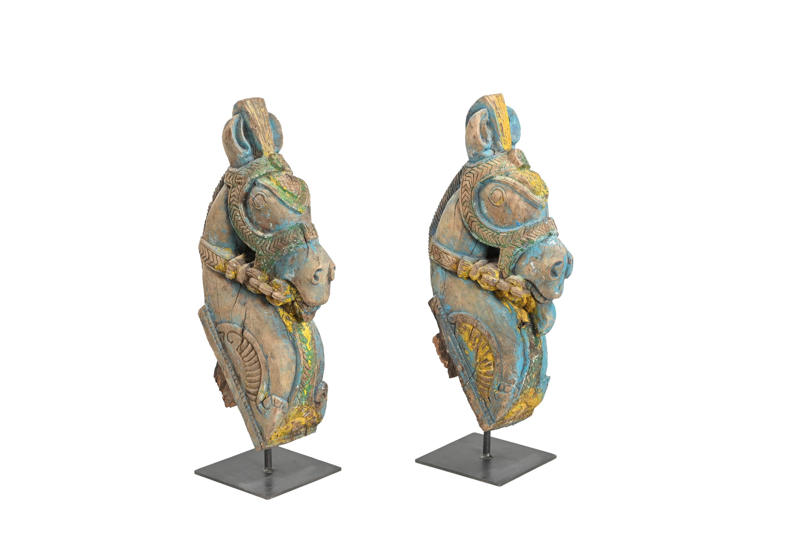Pair of Antique Indian Painted Teakwood Horse Corbel, of large scale, from a temple in Rajasthan, c. 1900. Very nice old paint and detail, a quality pair.
