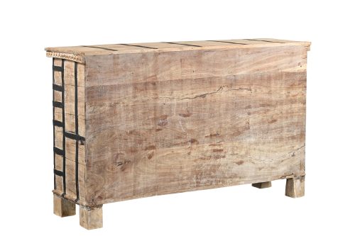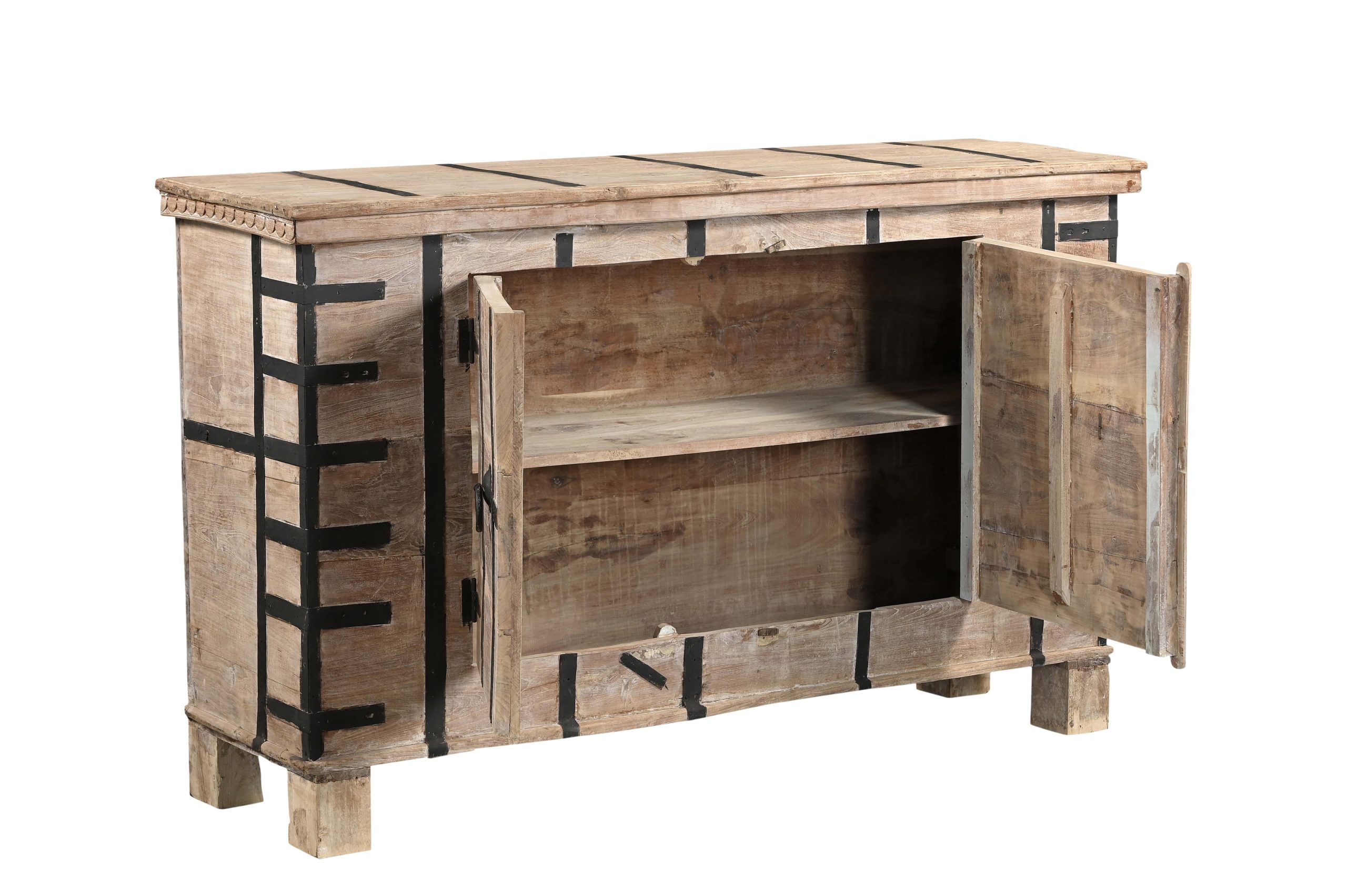 Vintage Indian Teakwood and Iron Pitara Chest, reduced in depth to make a buffet cabinet. The teakwood has been bleached and doors cut into the pitata chest facade for storage. A great country, rustic, or colonial style buffet.