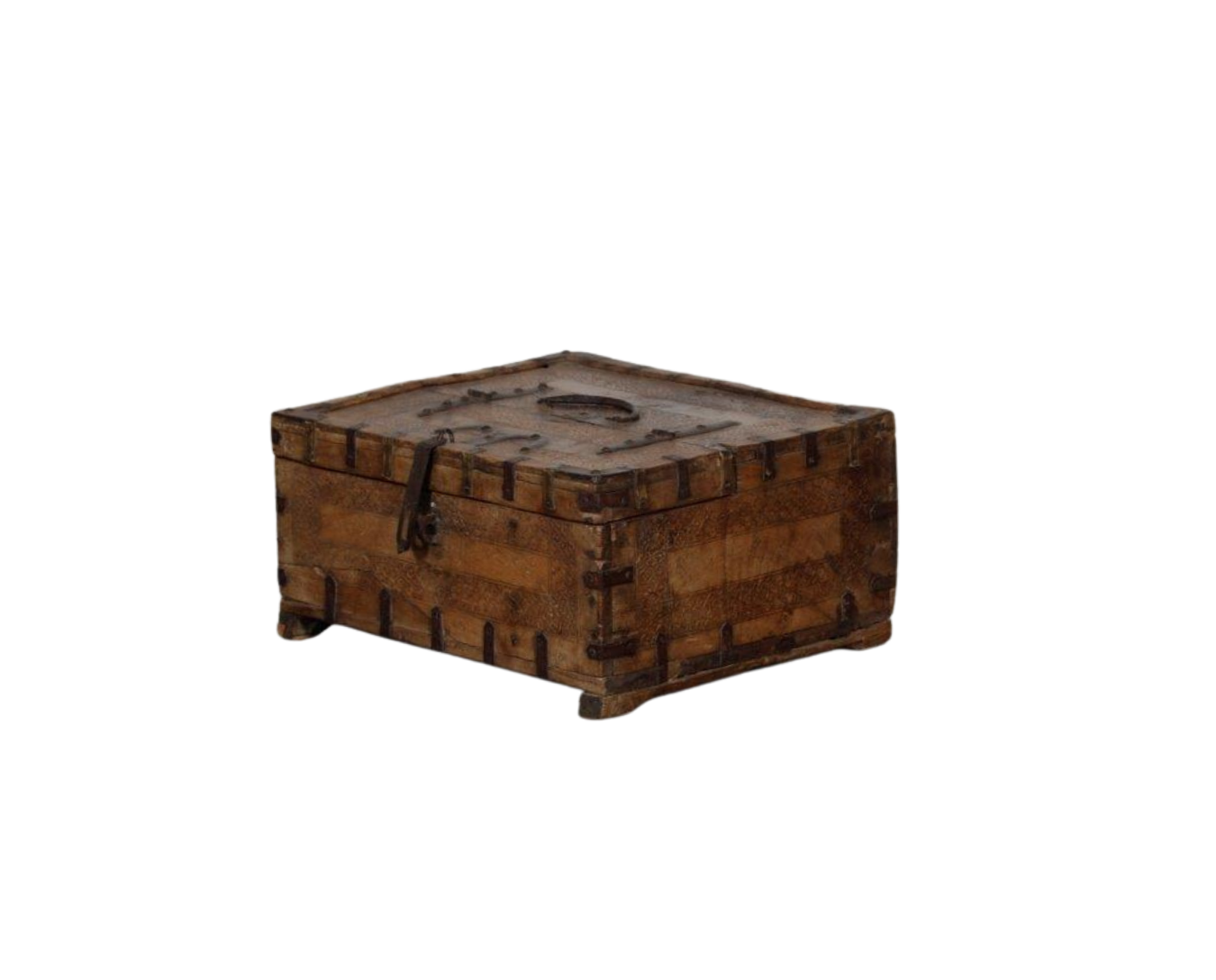 Antique Indian Teakwood Iron and Carved Small Chest, 6.5Hx13x11