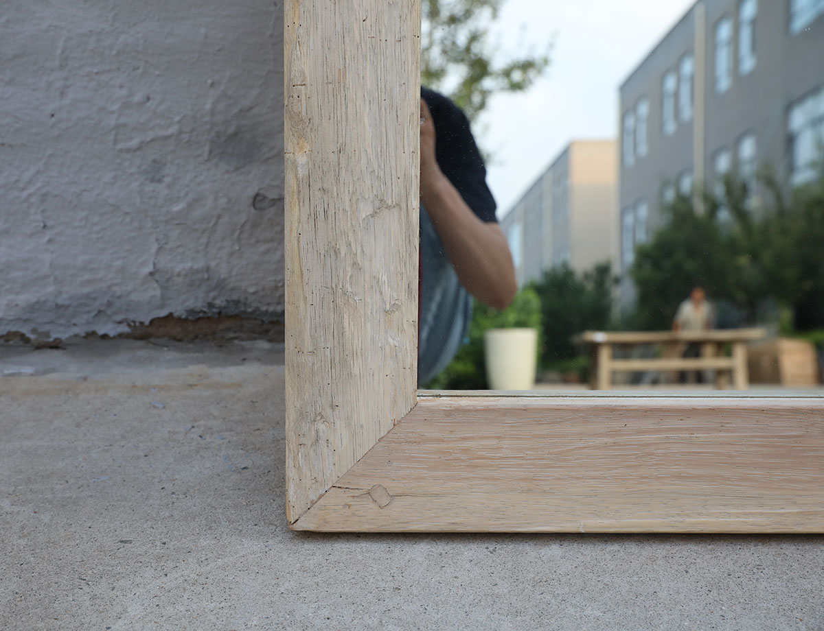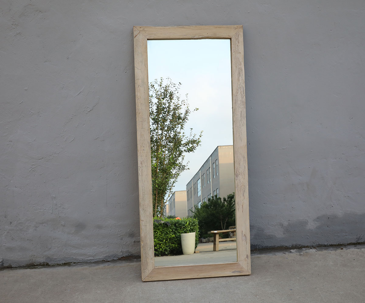 Antique Bleached Teakwood Window Frame Mirror on Iron Legs, 79Hx43x3