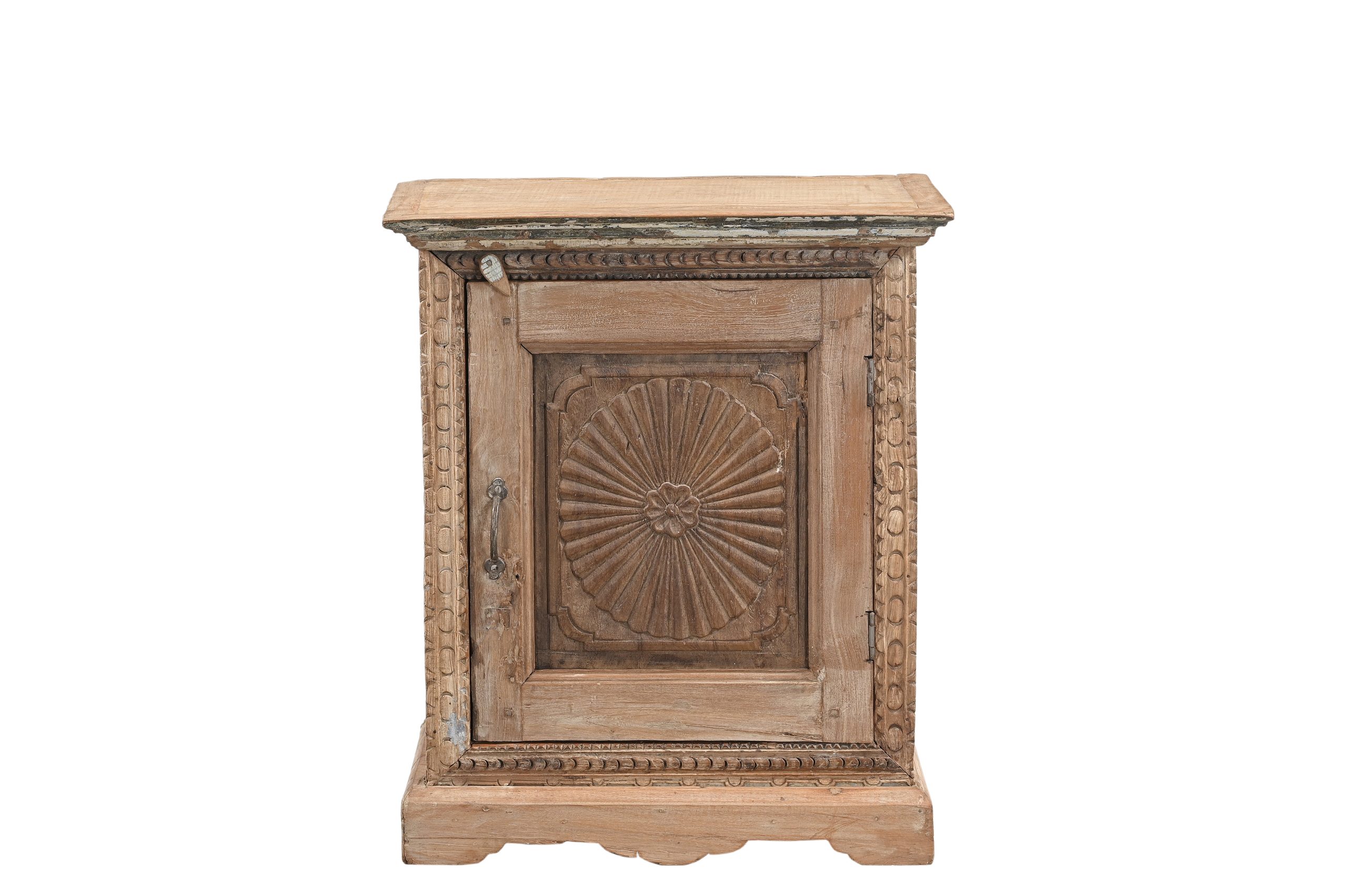 Indian Bleached Teakwood Nightstand, built from an antique Indian teak and reclaimed wood, it includes one sunburst carved door panel and rustic panel sides. Ideal beside a bed or as an accent table.