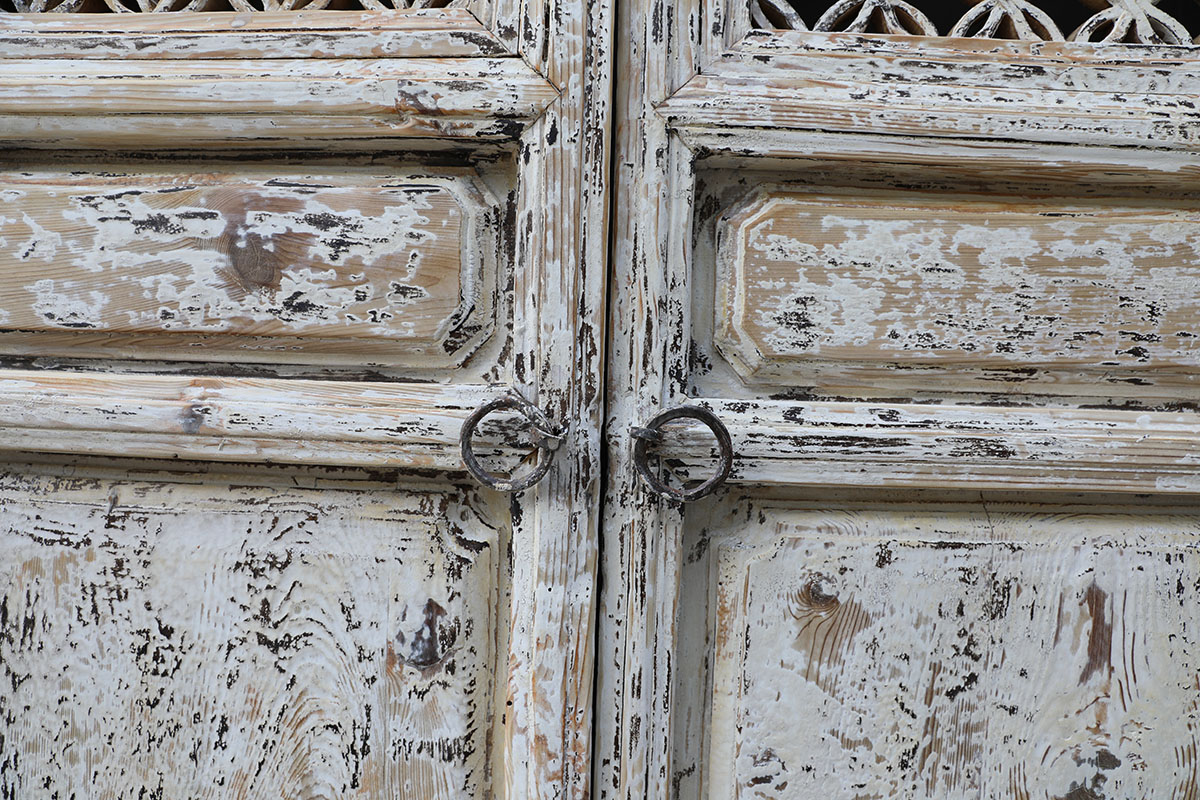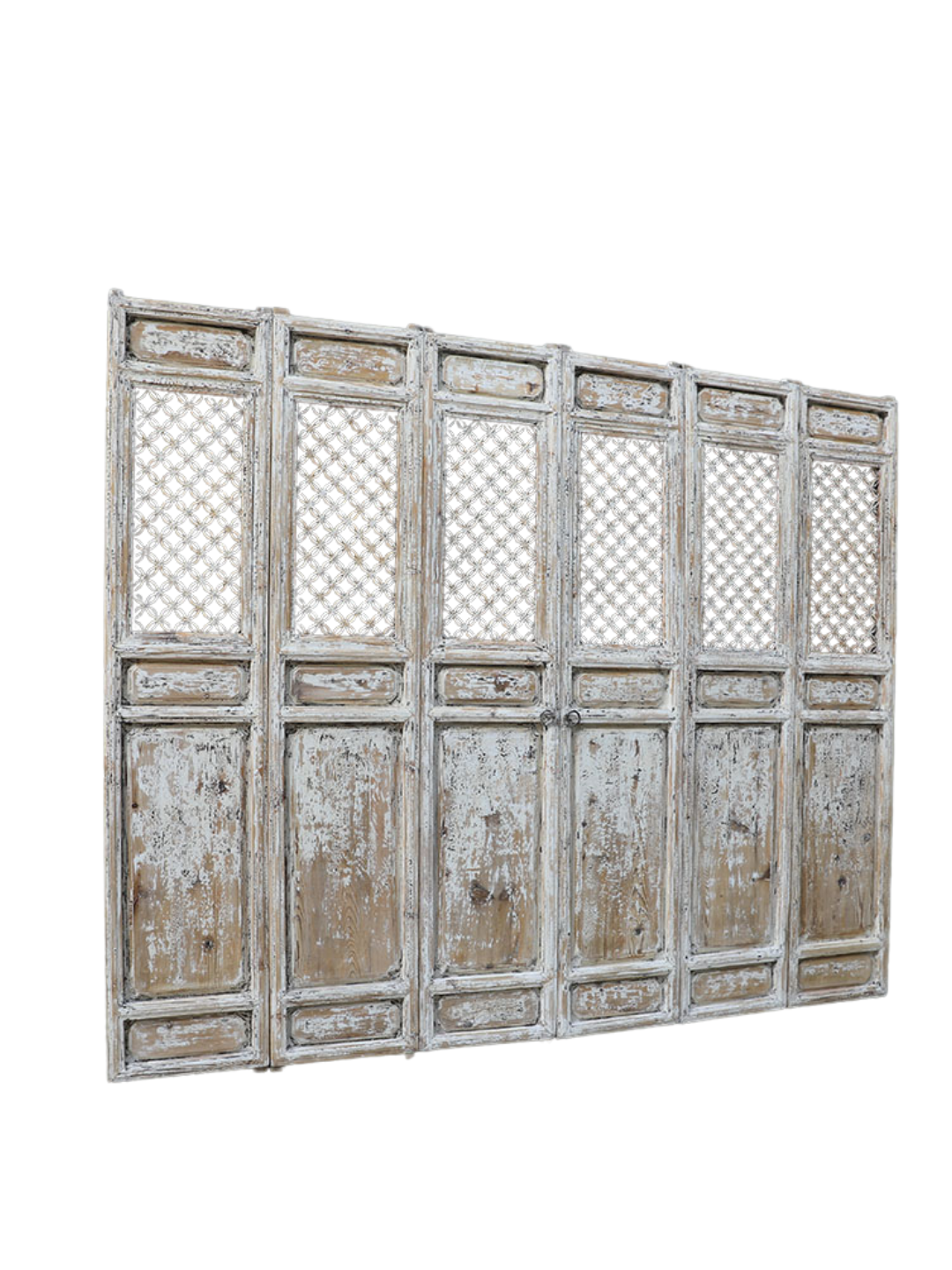 A beautifully balanced set of antique Chinese panels, with "floral" trellis tops, worn white paint finish and superb tall proportions. C. 1880-1900