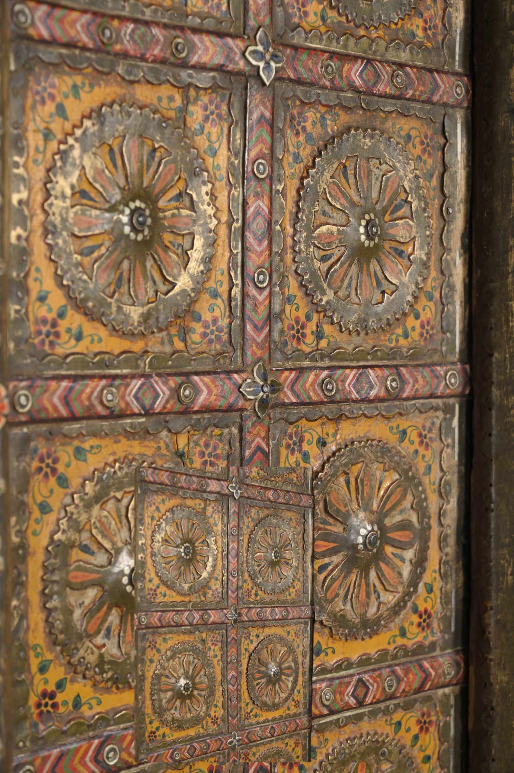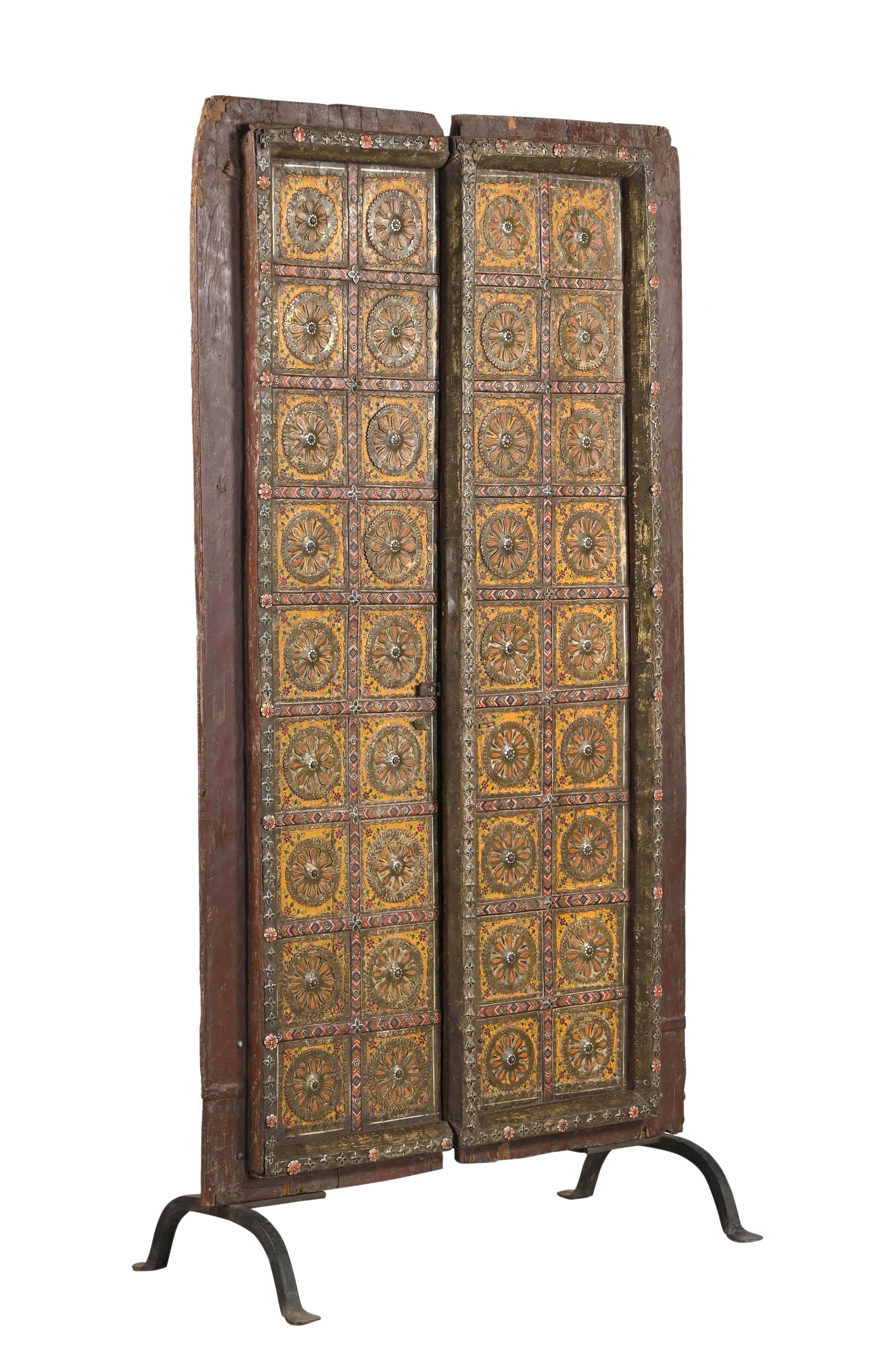 Antique Indian Painted Teakwood and Brass Door on Iron Stand, 70Hx38x2-19″ deep legs