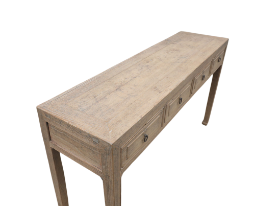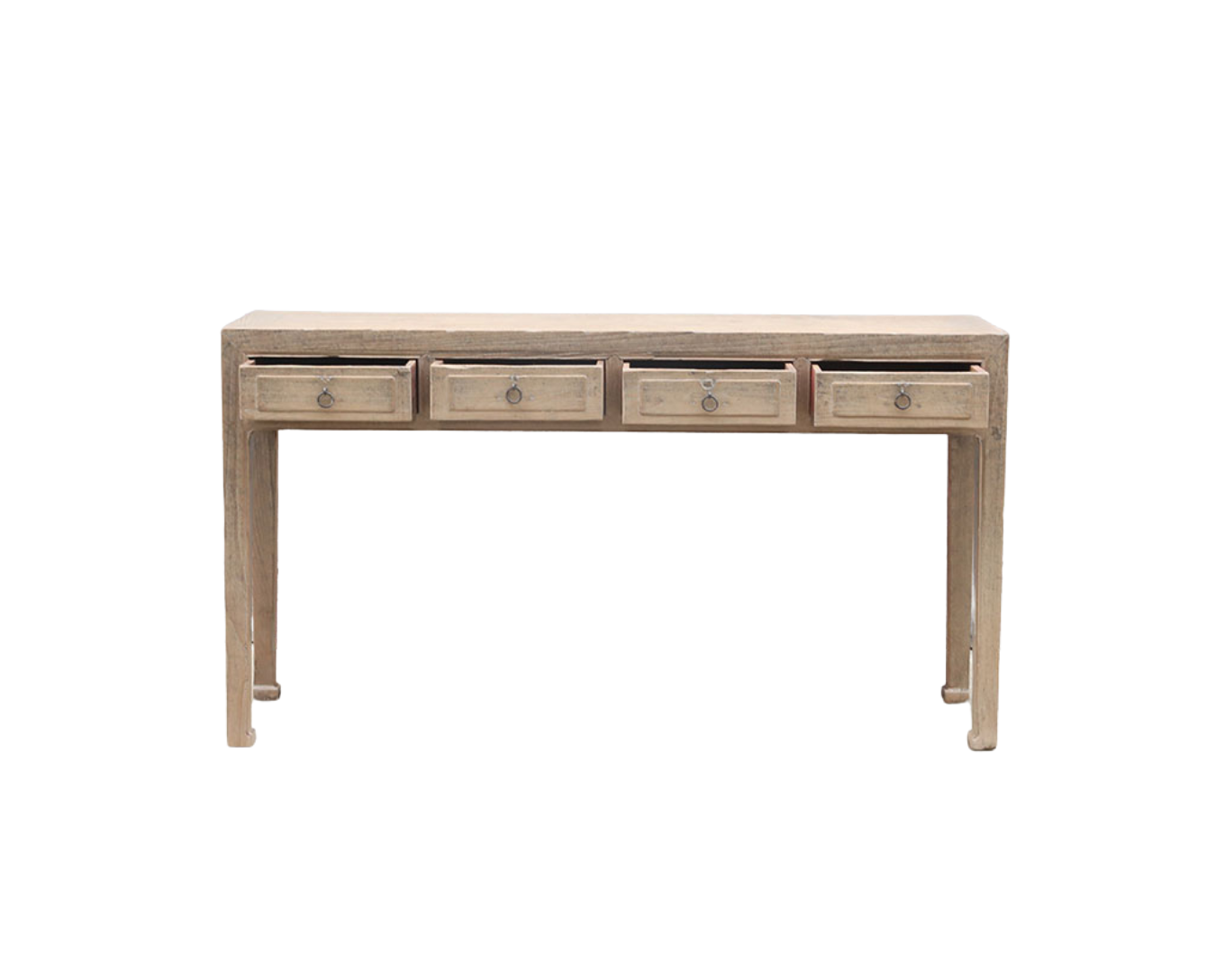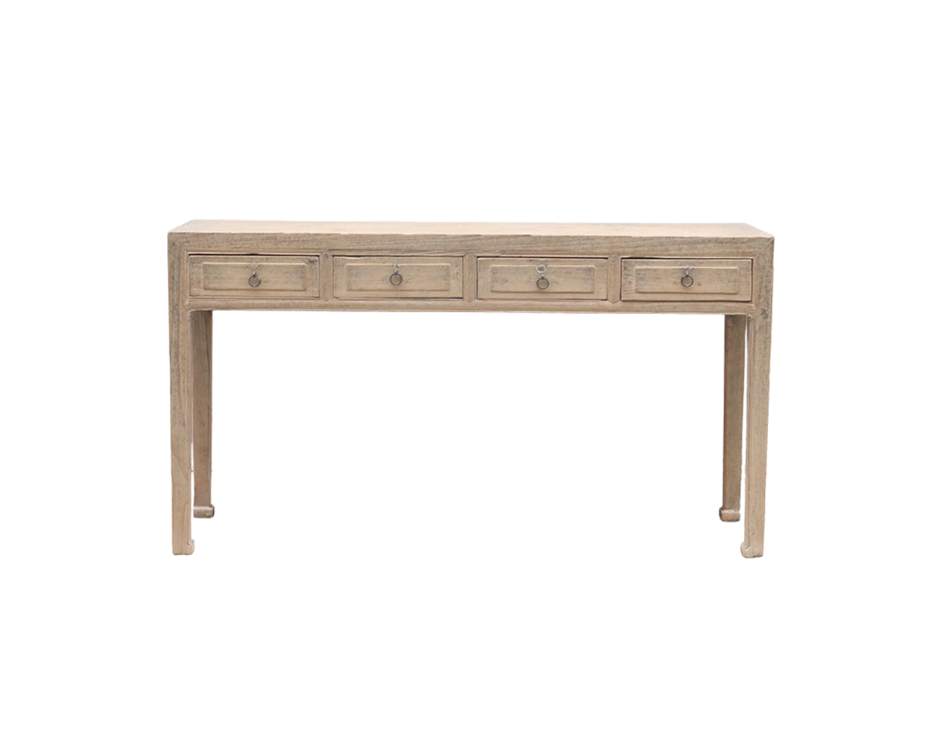 Vintage Chinese Elm Altar/Console Table, with 4 apron drawers, a mitered top, slight hoof feet and traces of its old black paint finish. It has been bleached to a warm elm patina, and is a sophisticated and refined "country" console table. 32.5Hx60x16