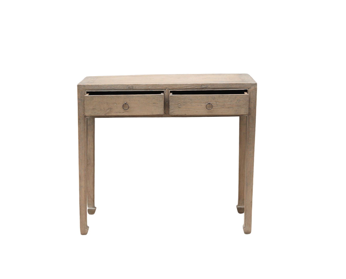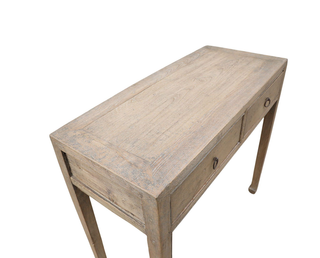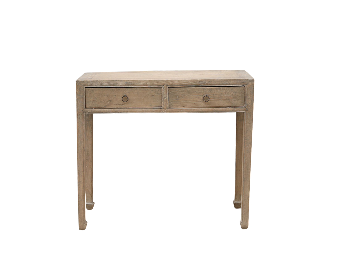 Vintage Chinese Bleached Elm Hall Table, with 2 apron drawers, a mitered top, hoof feet, and great patina. A simple yet sophisticated console or hall table.