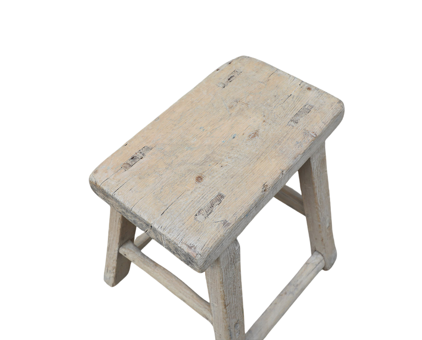Vintage Chinese Pine Stool, with a 2" thick top and worn stretchers that have seen many feet for many years. Superb color and finish. 20Hx17.5x10.5