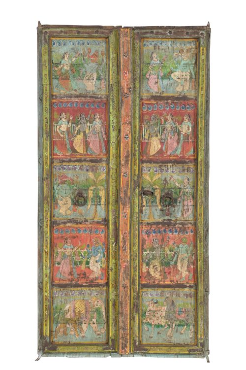 Vintage Indian Painted Teakwood Door, with faded depictions of Ganesh, gopis, and animals. A very fanciful piece of wall art from Rajasthan.