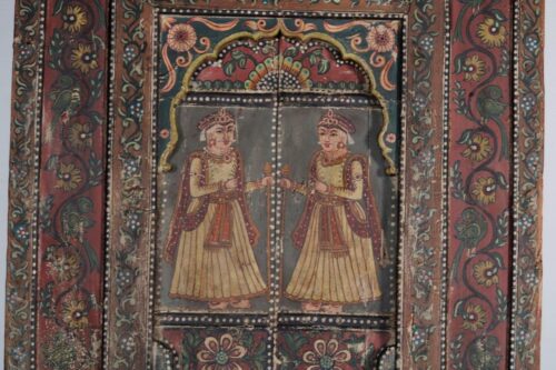 Vintage Indian Painted Teakwood Window Facade, a superb example of Rajasthani decorative art with a floral painted border, window panels decorated with Raj figures below a red "peacock" panel, and the narrow side panels with botanical and bird decoration. A gently faded paint finish enhances its allure and will make an outstanding piece of wall art. It is possible to add 6" iron feet to make it a free standing piece. Early to mid- 20th century from Rajasthan.