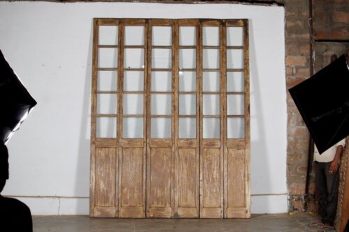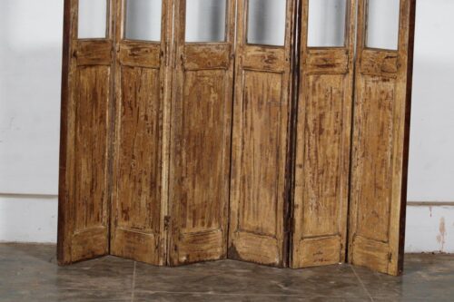 Vintage Indian Teakwood and Glass 6-panel Screen, of grand height and proportions. Found in Rajasthan, it features a slightly worn paint in a warm golden mustard color. A fabulous space divider or it can be used as a large art piece on a wall. Textiles as curtains could be added for privacy. The back side (last photo) is similar but with the paint more worn. From the 1st half of the 20th century.