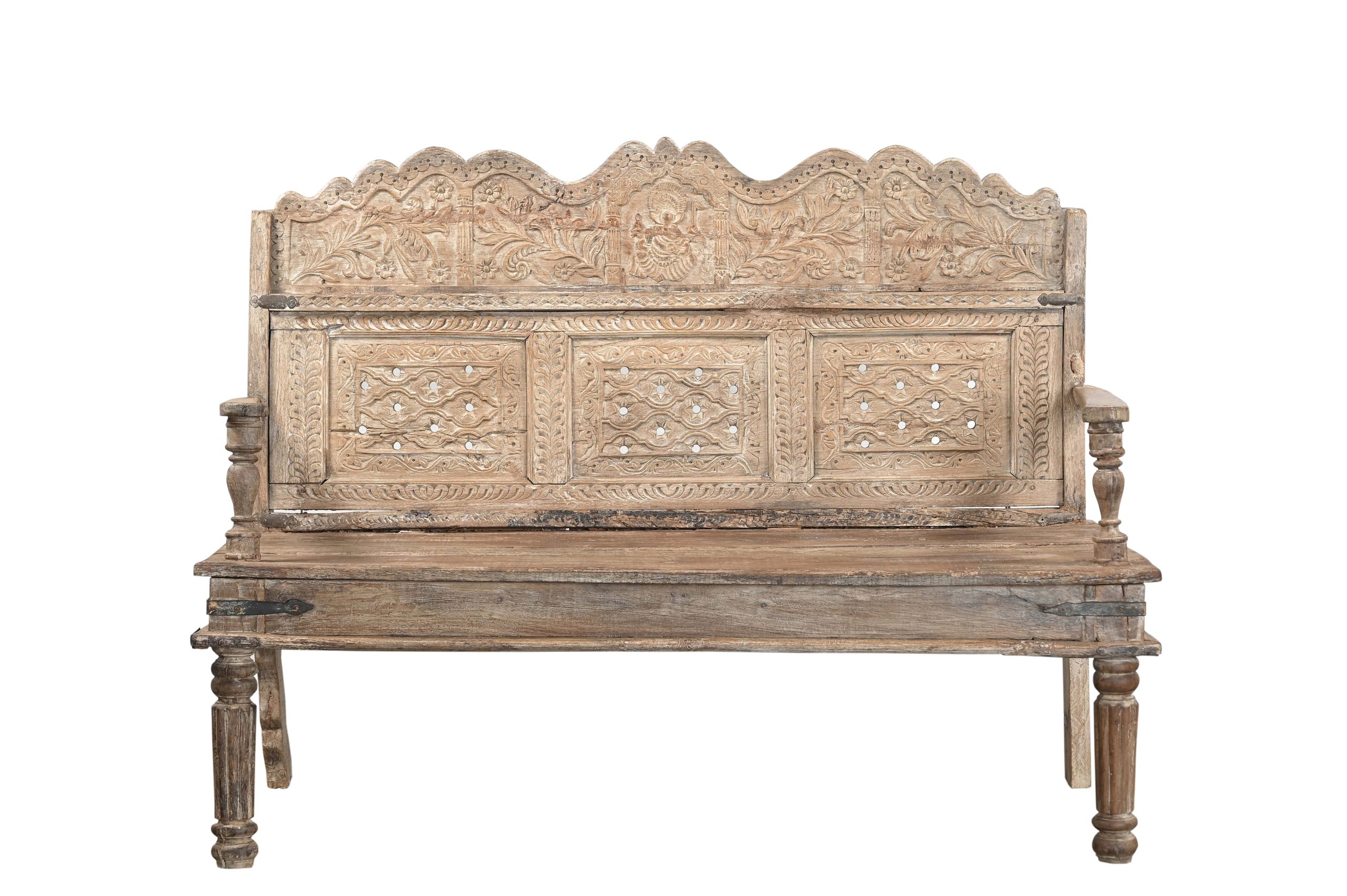 Vintage Spanish Colonial Style Indian Teakwood Carved Bench, 39Hx53x23