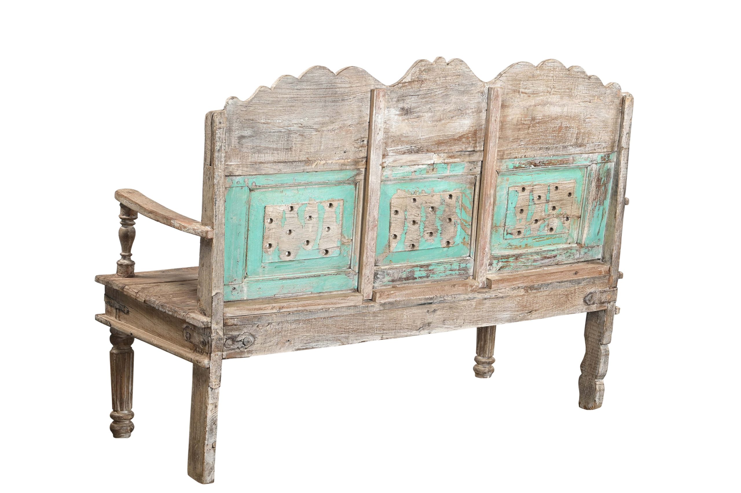 Vintage Spanish Colonial Style Indian Teakwood Carved Bench, in a beautiful light teakwood color, cobbled together from antique parts in a Rajasthani atelier. The colonial style back is profusely carved with pierced stars, and a scrolling crownboard centered with a deity and surrounded by floral motifs. An outstanding colonial style bench, probably made in the last half of the 20th century.
