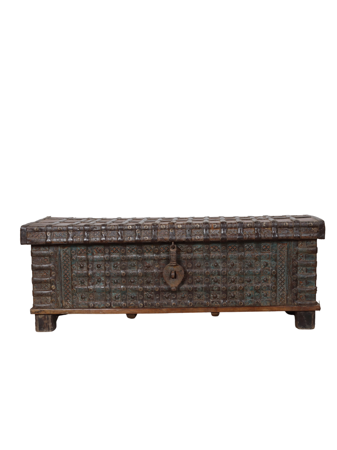 Antique Indian Teakwood Pitara Chest "Bed Bench", with outstanding iron and brass decoration to the facade and iron banding throughout. A high quality chest perfect at the foot of a bed for storage and sitting. This piece will arrive in Santa Fe in April '26 51x18x19H