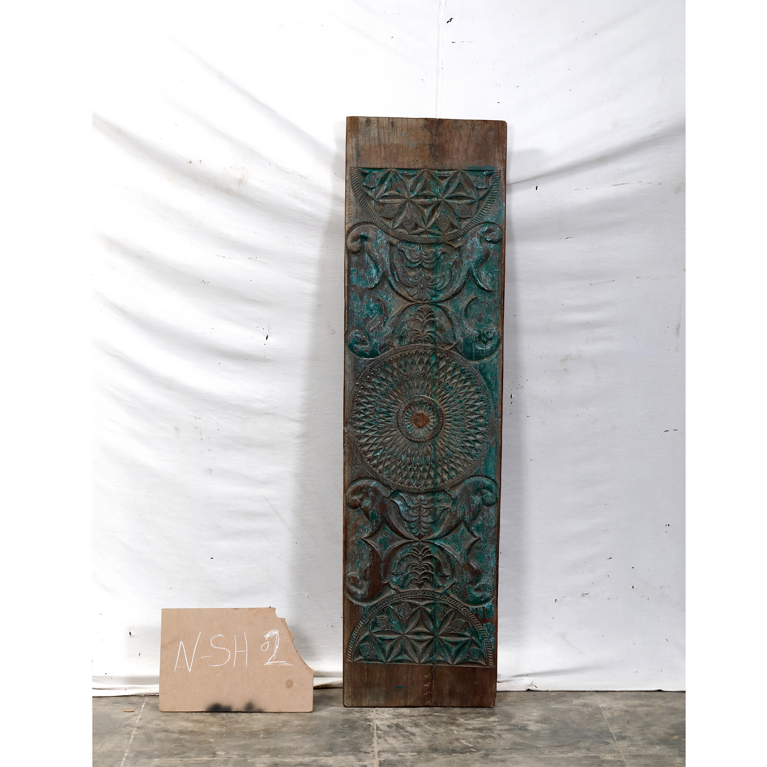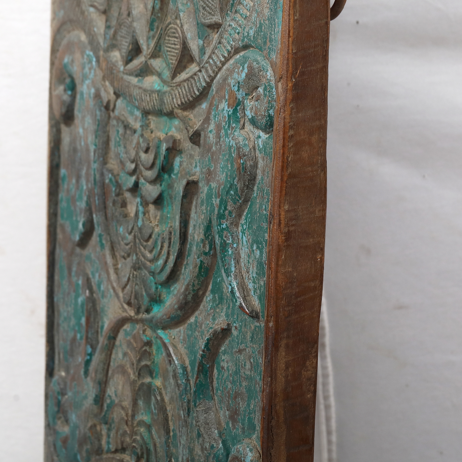 Antique Indian Carved and Painted Teakwood Crown Board. c. 1880-1900, from Rajasthan, retaining much of its old blue/green paint finish. Centered by a crisply carved mandela and birds, it can be hung in either direction. This piece will arrive in Santa Fe in April '26