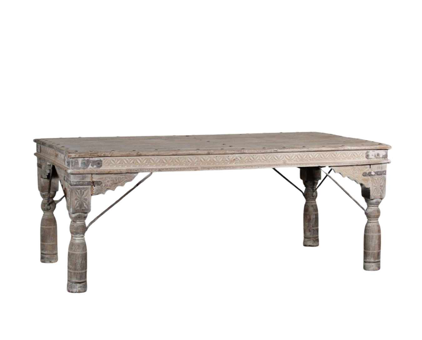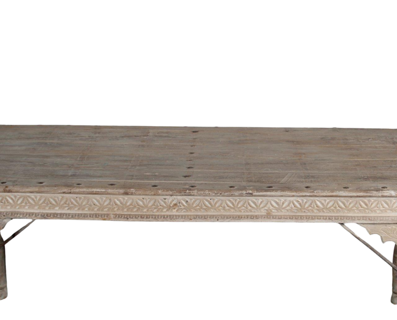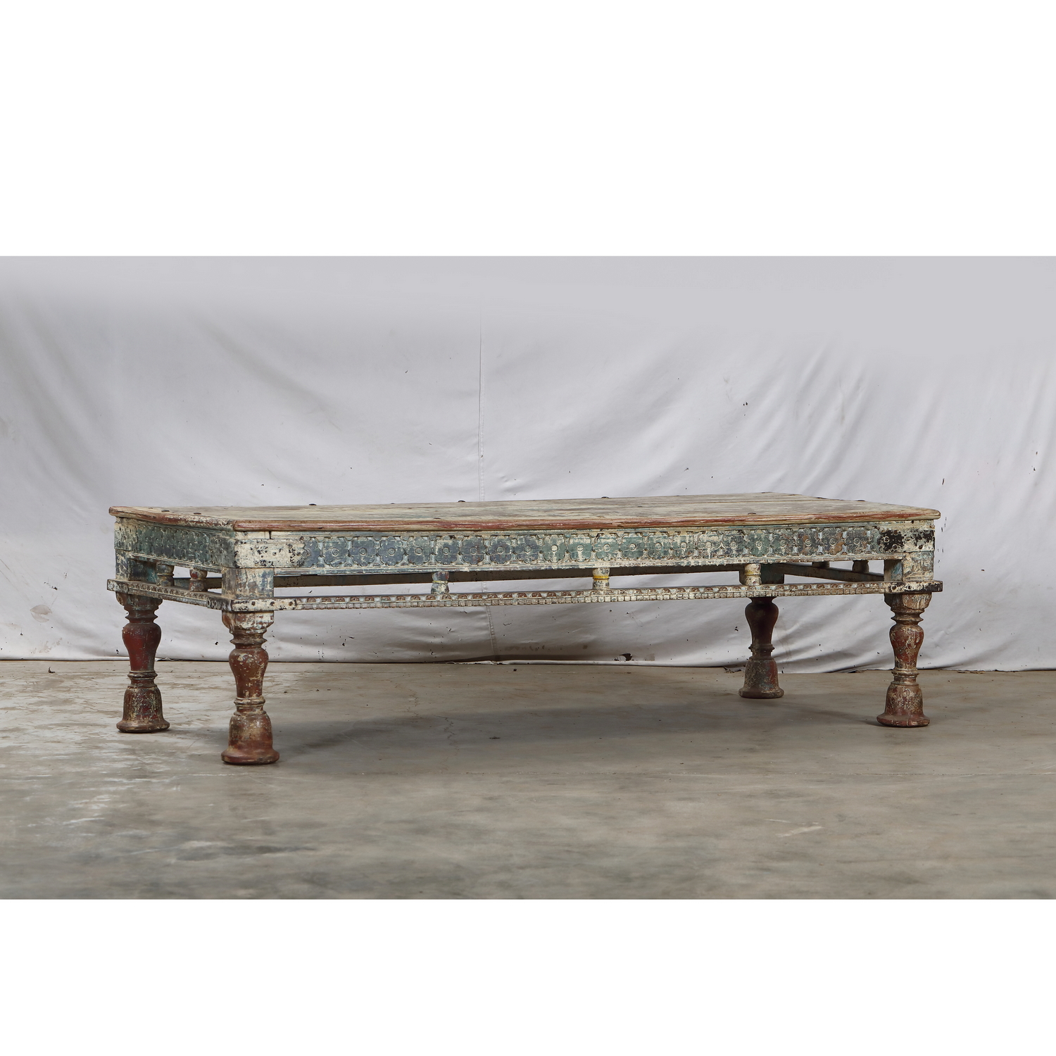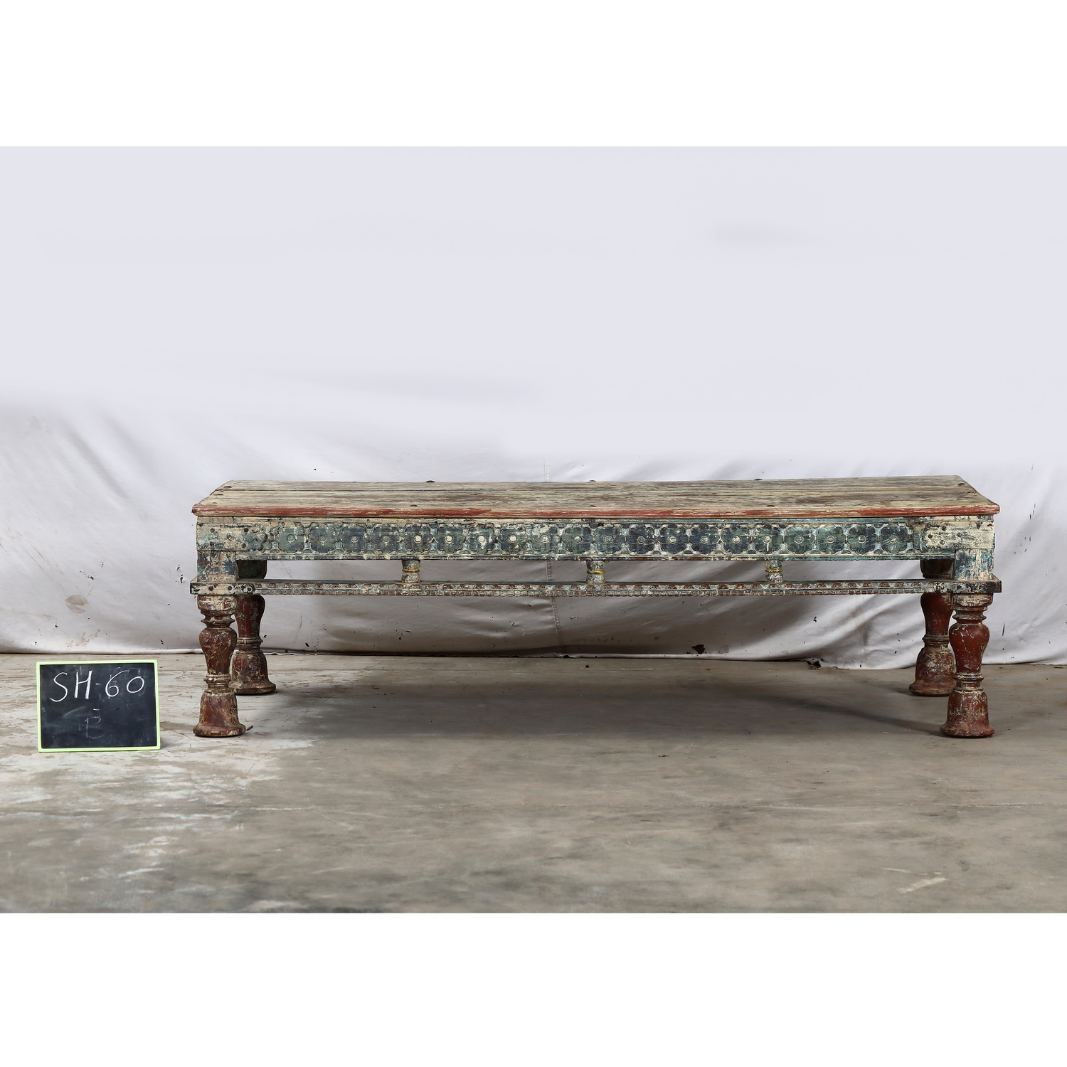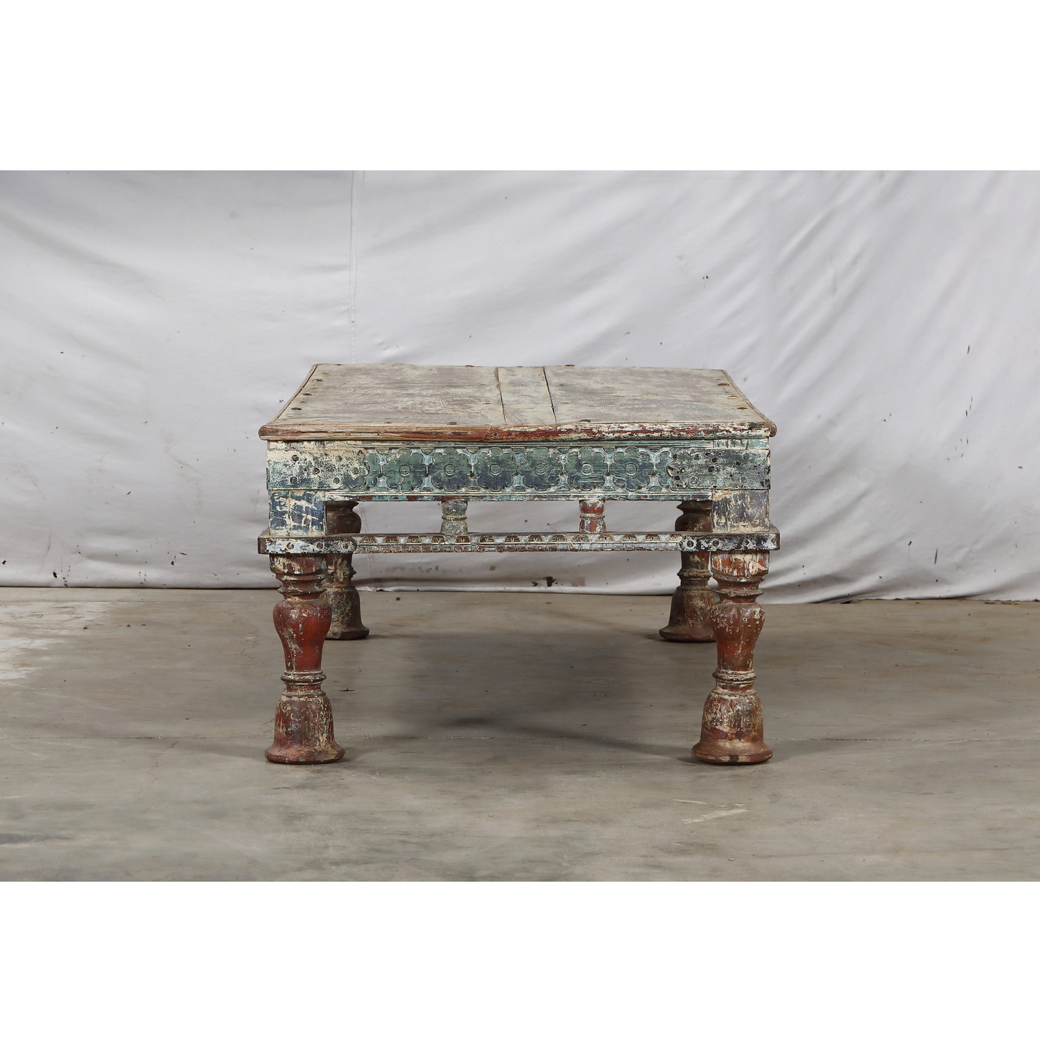 Antique Indian Painted Teakwood Low Table, c. 1880-1900, found in Rajasthan. It has all of the bells and whistles, with original paint, a beautifully carved apron and stretcher, crisp "vase and bell" turned legs, well worn patinated top with border nailhead decoration, and in its original condition. This is the best one I've been able to find, a collector's table. This piece will arrive in Santa Fe in April '26 68x30x20H